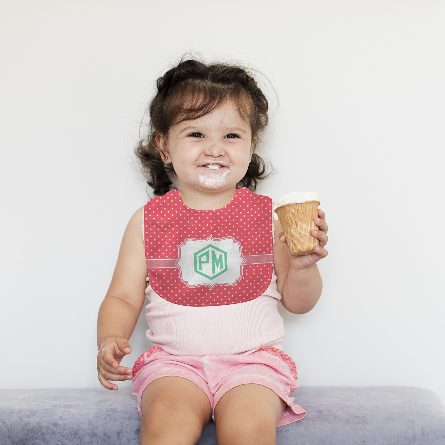 Made of soft polyester, each customizable bib hugs comfortably around the neck to catch every drip and drool. Each bib design is printed with baby-safe ink and finished with a secure stitch pattern and velcro clasp. We carry two customizable bib styles -Microfiber Velour and Jersey Knit.