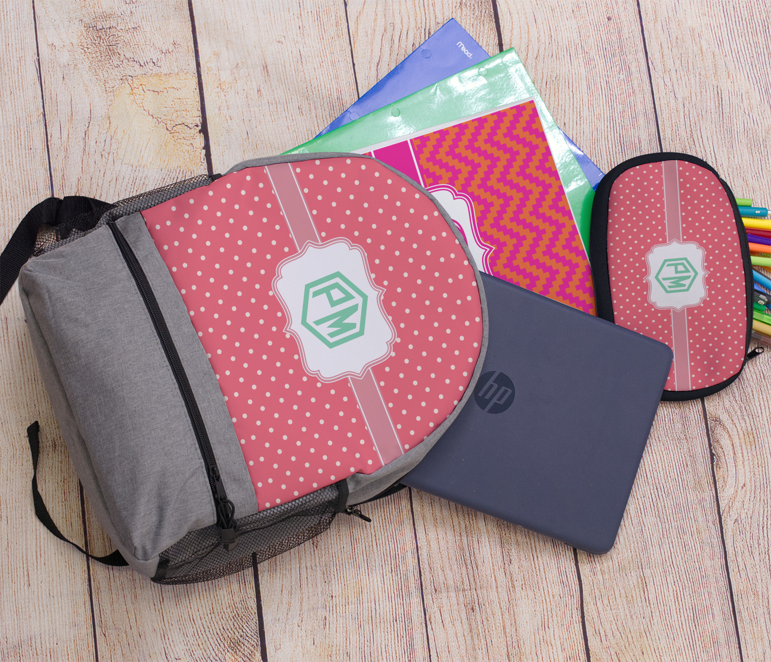 The pixelated chevron stripe pattern alternates between the hot pink and orange. The design has a classic ribbon in hot pink with white stripes. The decorative rectangular label is also in hot pink and white. The personalization is the gorgeous interlocking monogram in hot pink to pull the entire design together.