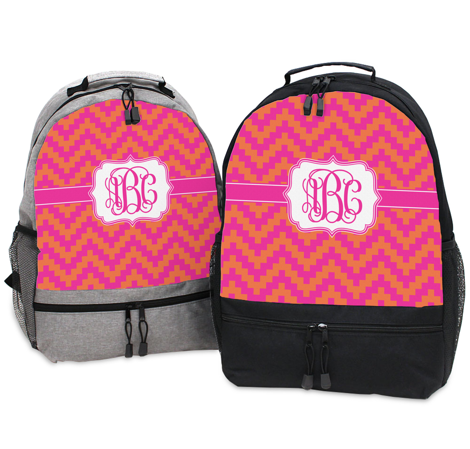 The pixelated chevron stripe pattern alternates between the hot pink and orange. The design has a classic ribbon in hot pink with white stripes. The decorative rectangular label is also in hot pink and white. The personalization is the gorgeous interlocking monogram in hot pink to pull the entire design together.