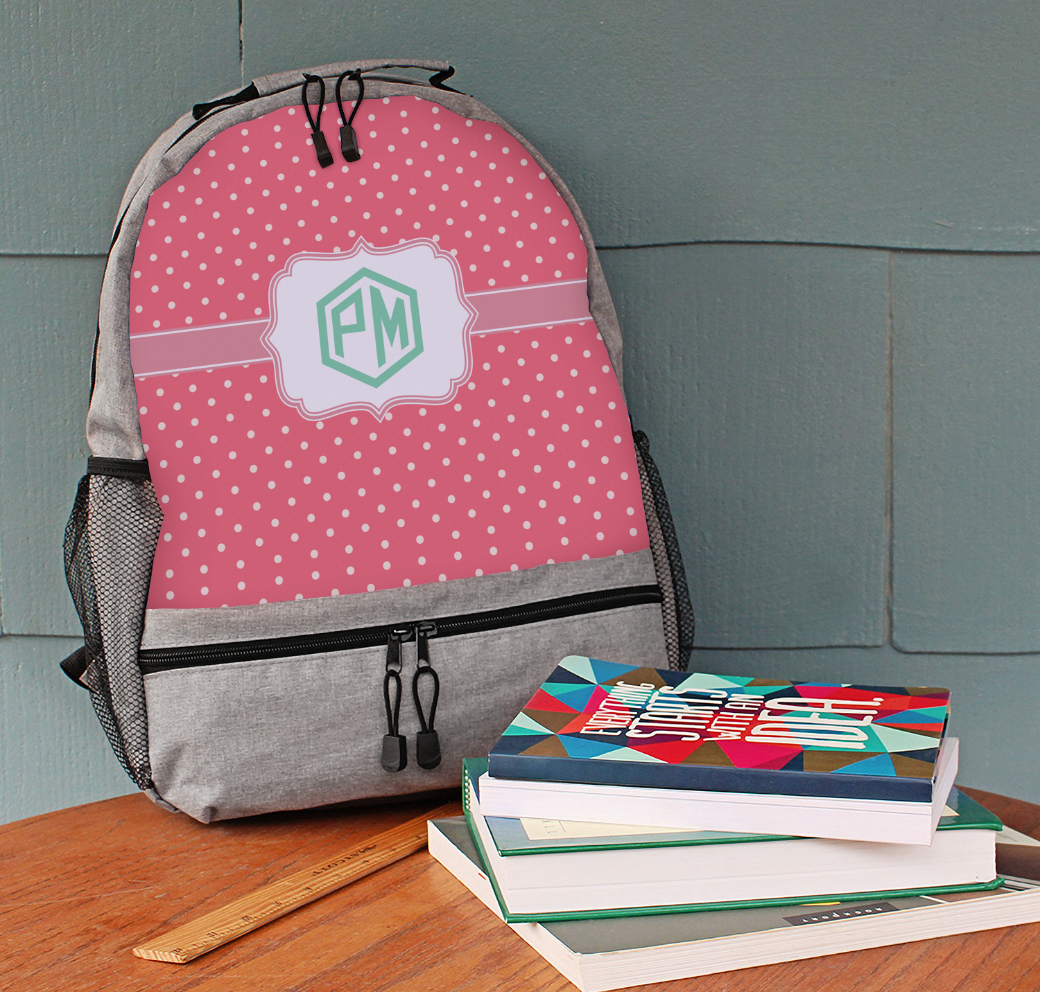 The pixelated chevron stripe pattern alternates between the hot pink and orange. The design has a classic ribbon in hot pink with white stripes. The decorative rectangular label is also in hot pink and white. The personalization is the gorgeous interlocking monogram in hot pink to pull the entire design together.