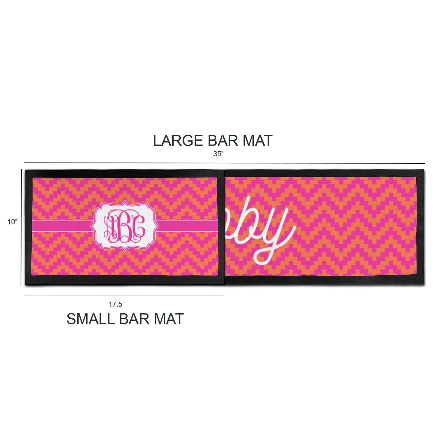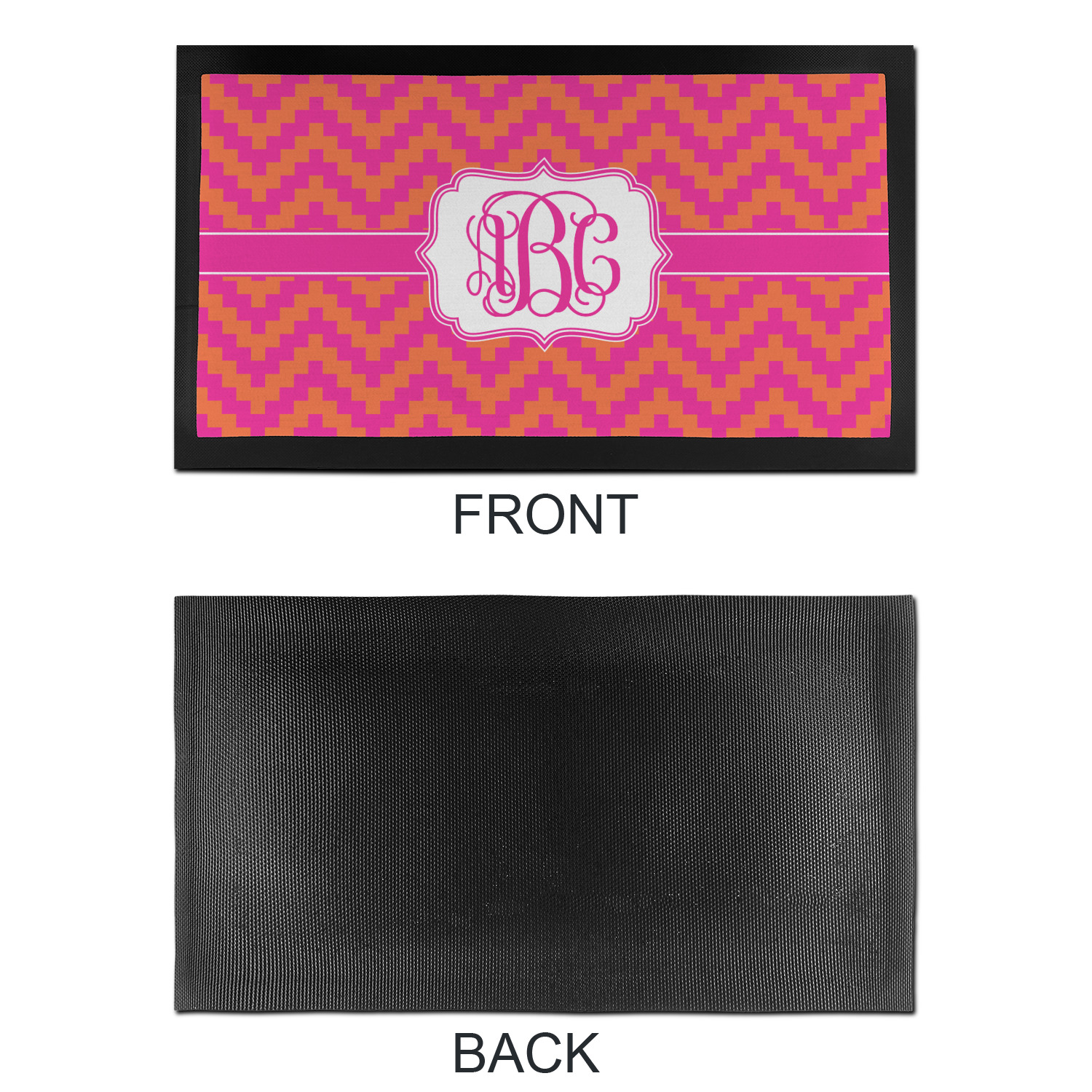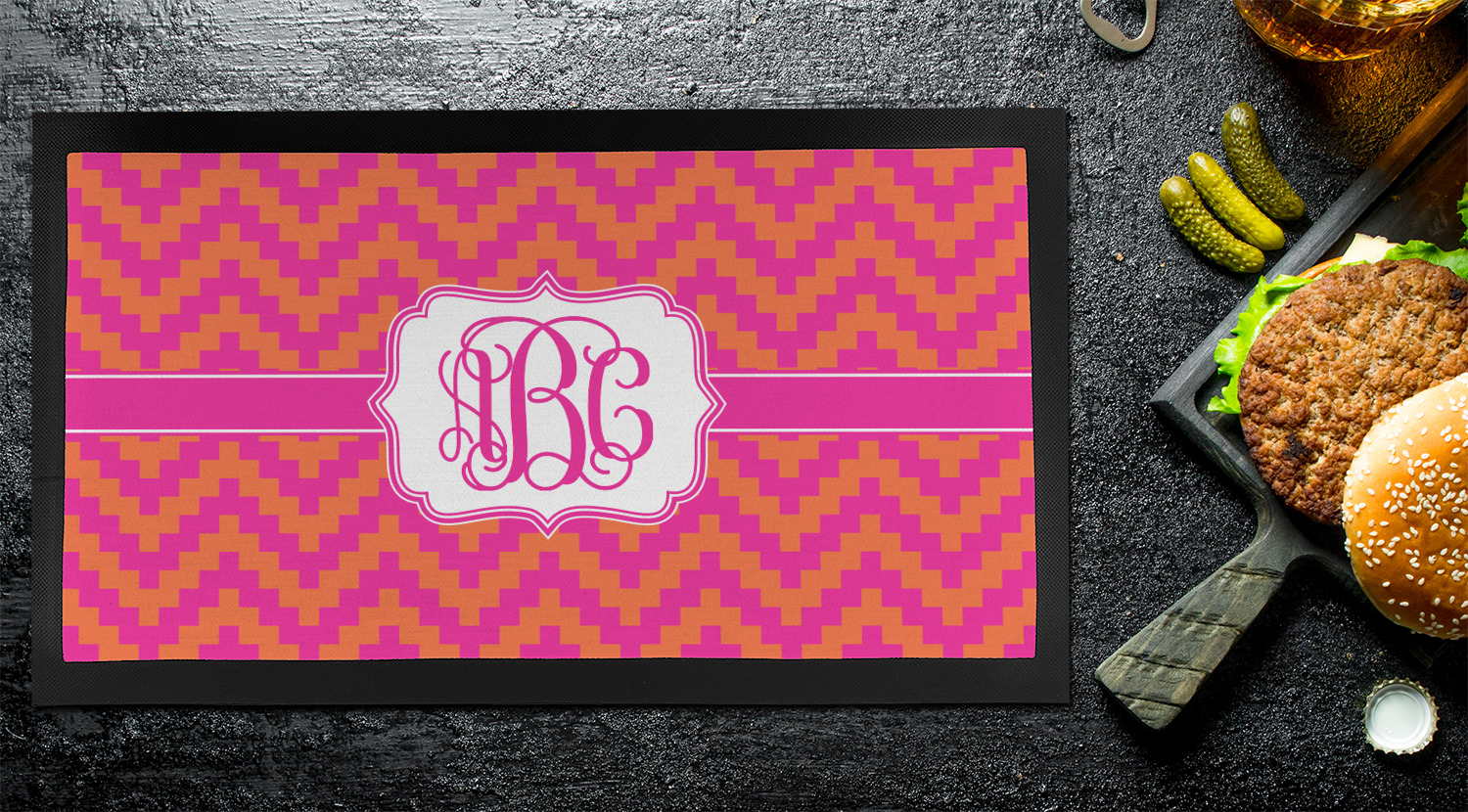 The pixelated chevron stripe pattern alternates between the hot pink and orange. The design has a classic ribbon in hot pink with white stripes. The decorative rectangular label is also in hot pink and white. The personalization is the gorgeous interlocking monogram in hot pink to pull the entire design together.