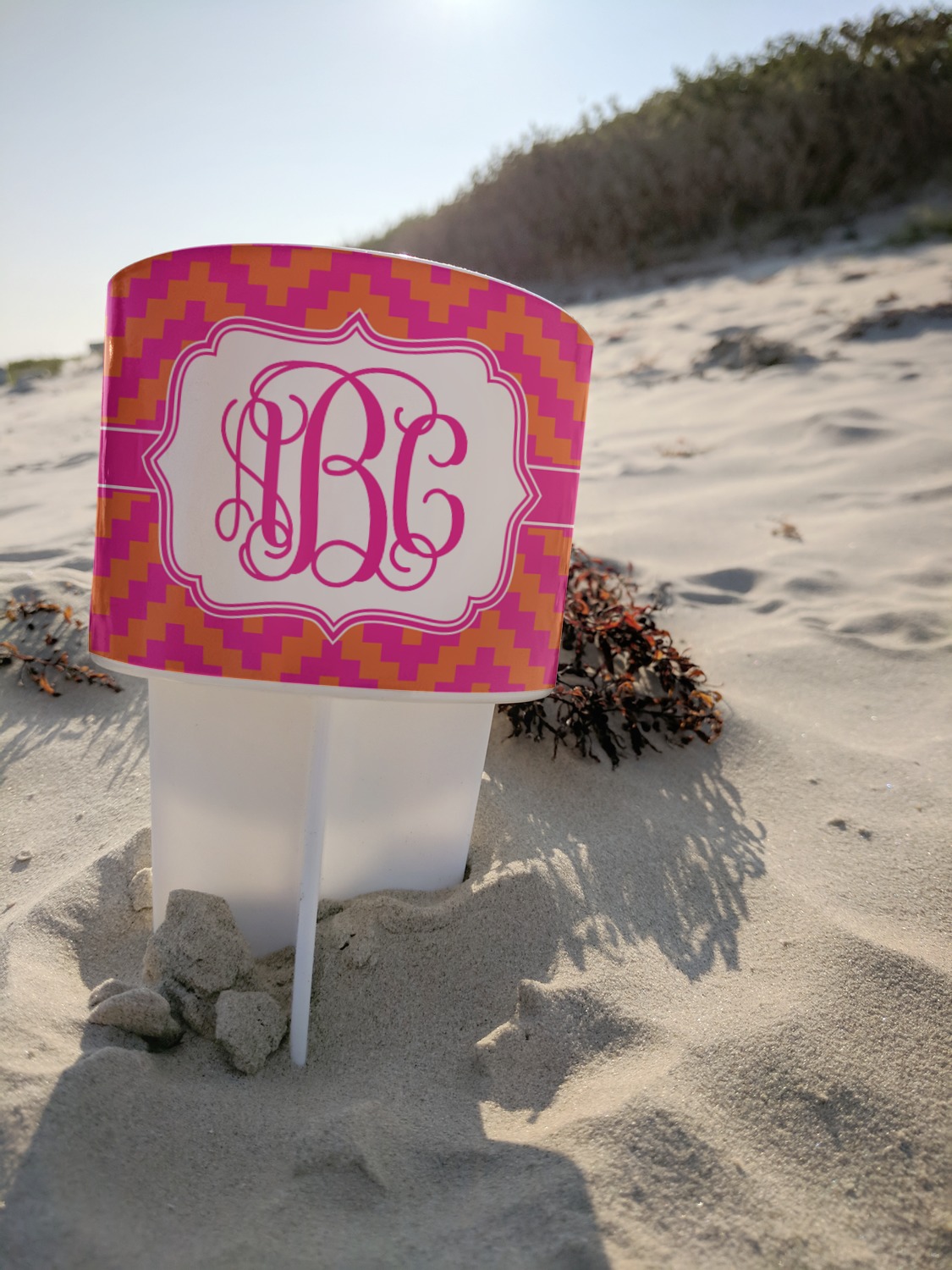 This cup holder has a large stake at its bottom that anchors it to the sand or ground below, while the cup holder rests above the stake. The entire drink holder is made of durable plastic and displays your customization around the cup holder portion. We sell these personalized beach spikers in two different colors: black and white.