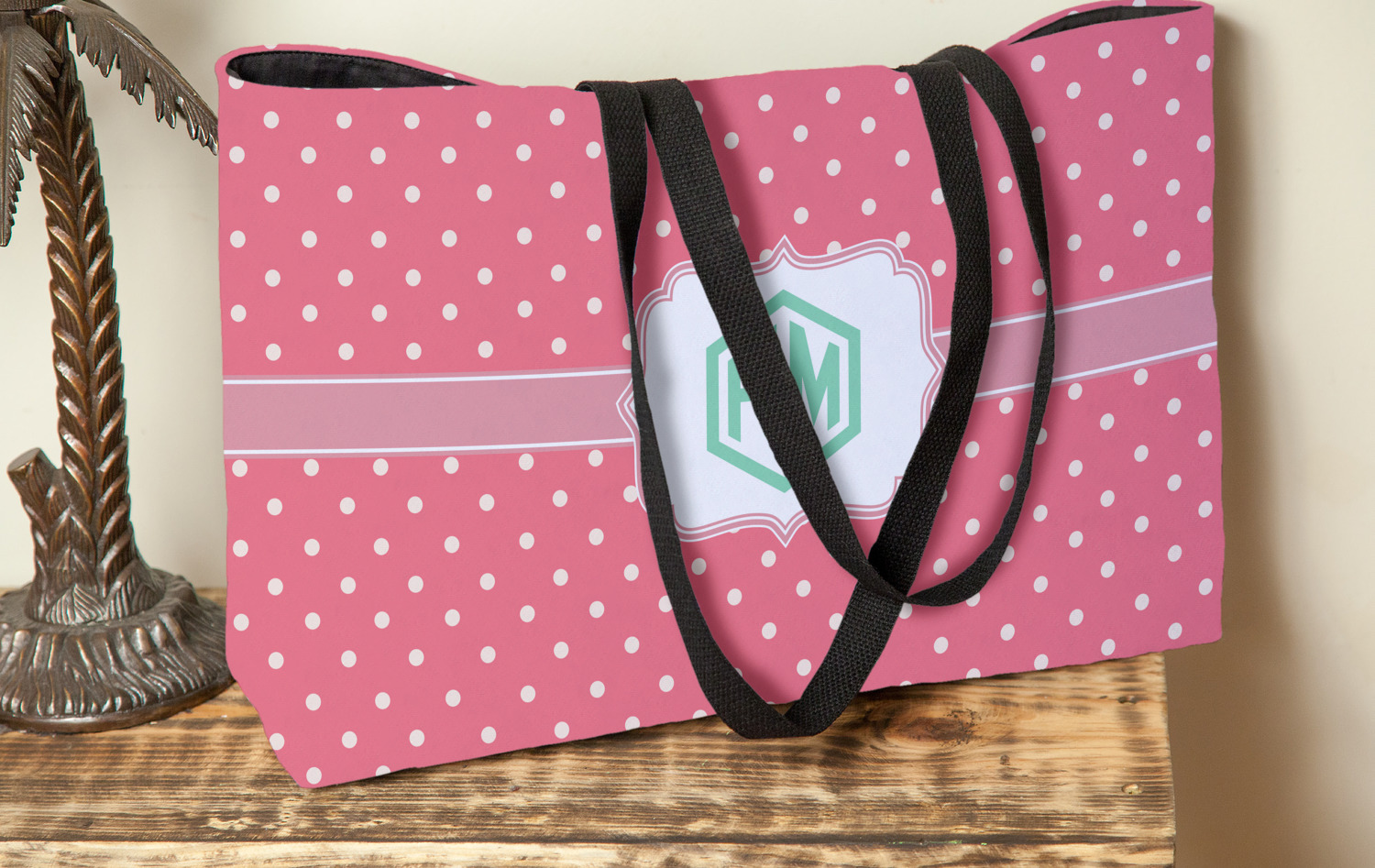 The totes are made from a sturdy canvas material on the outside and are lined with a black poly cotton lining. The beach totes have an approx. 28" black woven handles.