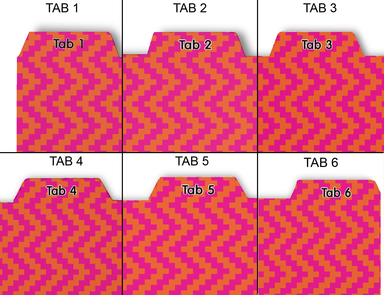 Whether you use binders at school or at work, we have designs to suit all of them. Available in 5 or 6 tab sets, you are sure to find a set to suit your needs. The back of each one is white and can be used to take notes, write vital information on, etc.