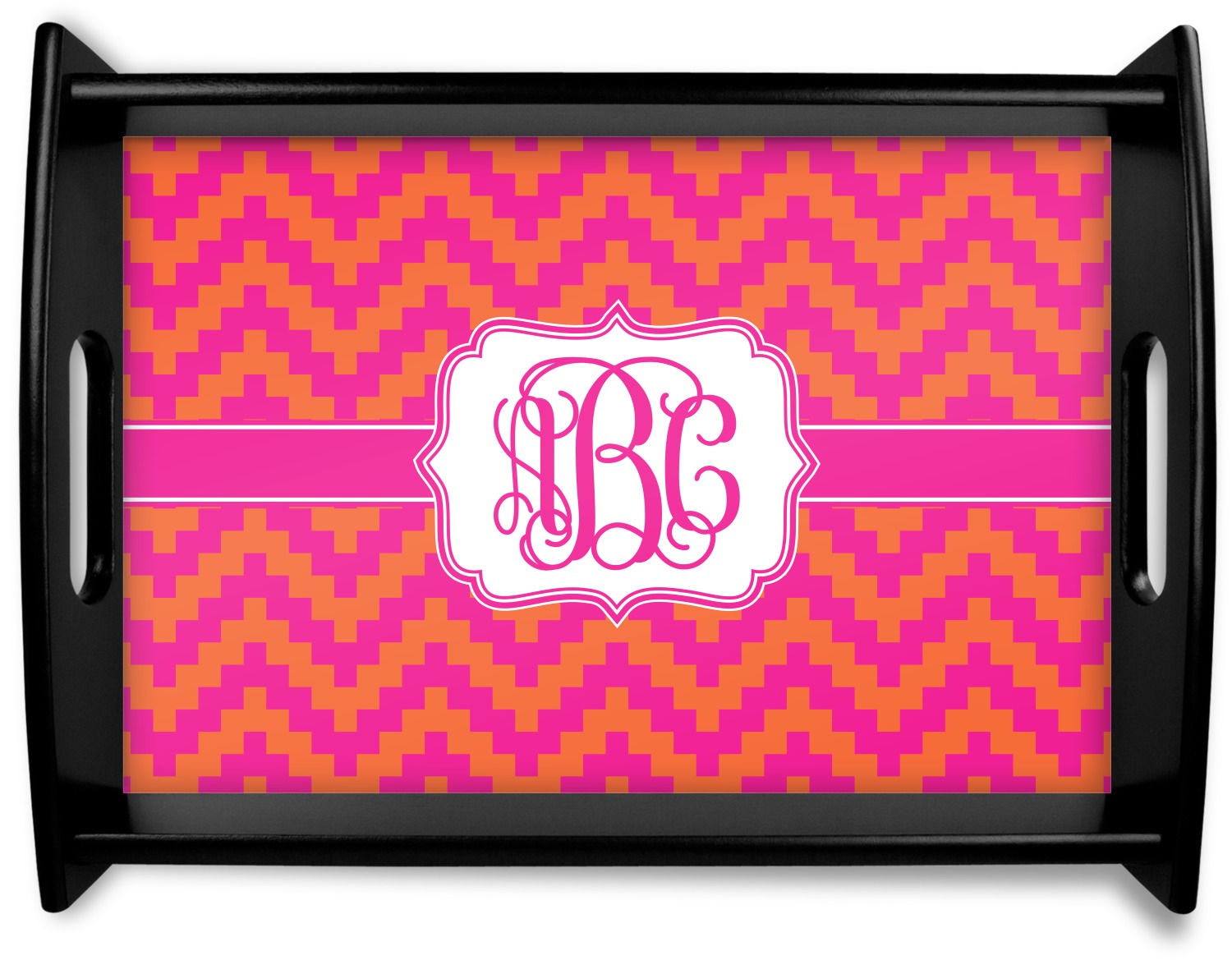 The pixelated chevron stripe pattern alternates between the hot pink and orange. The design has a classic ribbon in hot pink with white stripes. The decorative rectangular label is also in hot pink and white. The personalization is the gorgeous interlocking monogram in hot pink to pull the entire design together.