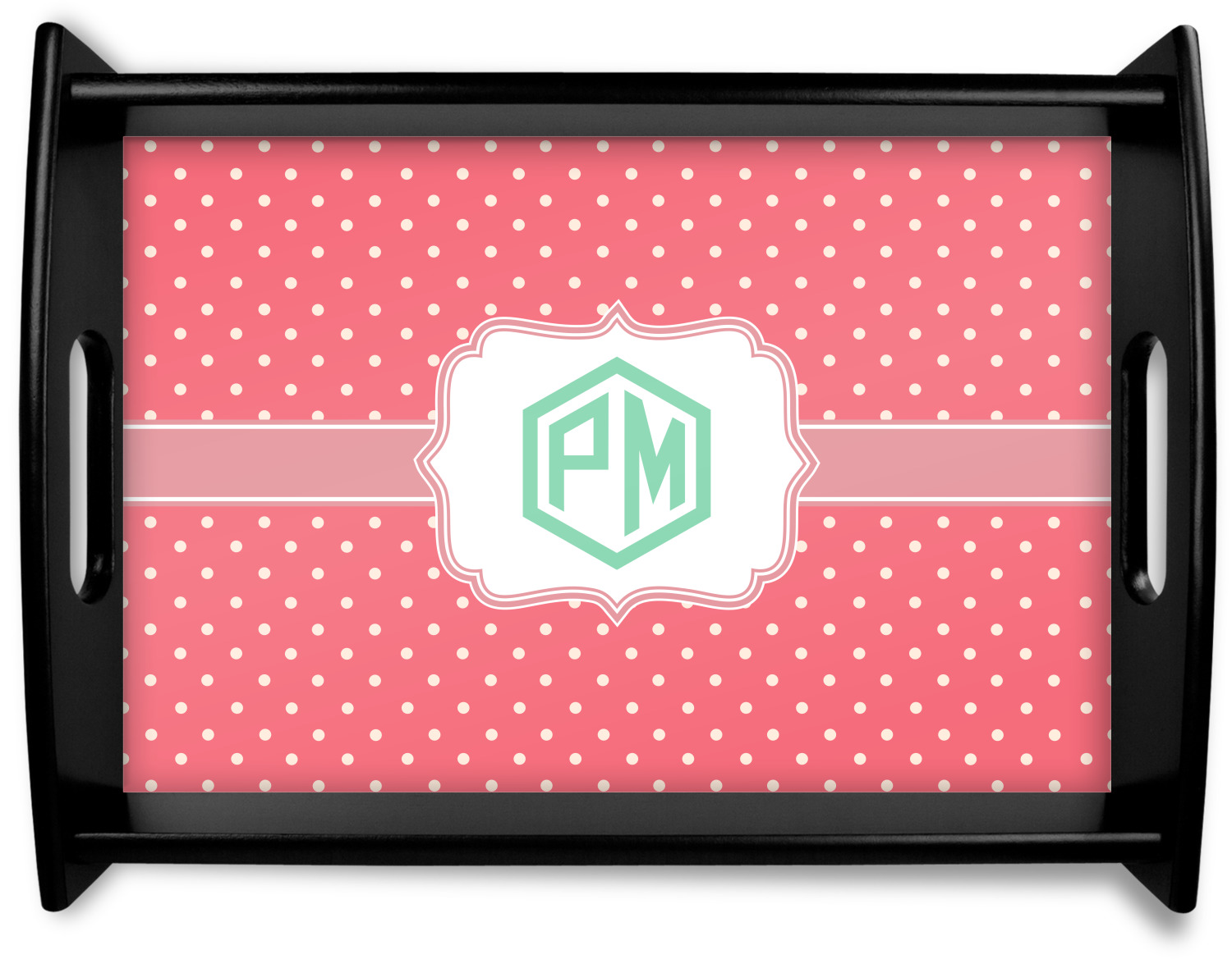 This serving tray with handles features square edges and two rounded sides, creating a very modern look. Each side is fabricated from a beautifully cut, natural wood. The bottom of the interior of the tray displays your customized design in bright, vibrant color. The tray is sold in both a black color and a natural wood look. Each variation of the wood serving tray has two sizes: Small, which is 14" x 10" x 2.25", and Large, which is 19.5" x 13.5" x 2.75".