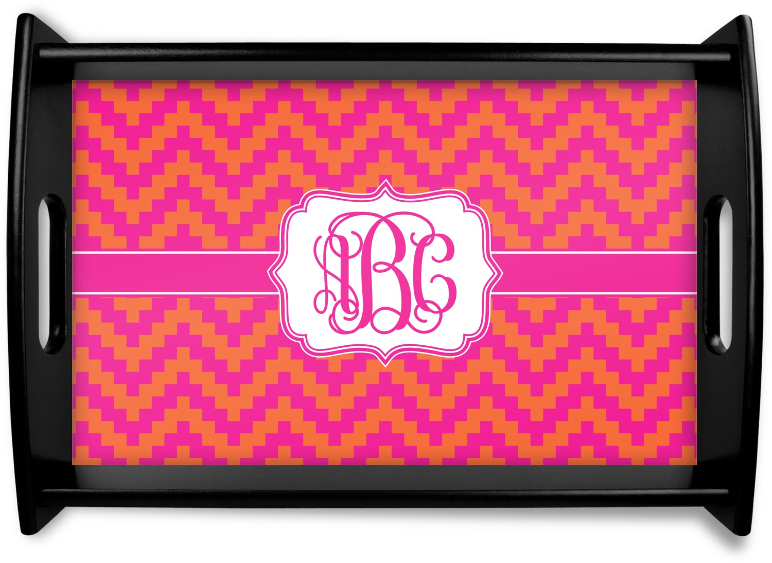 The pixelated chevron stripe pattern alternates between the hot pink and orange. The design has a classic ribbon in hot pink with white stripes. The decorative rectangular label is also in hot pink and white. The personalization is the gorgeous interlocking monogram in hot pink to pull the entire design together.