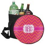 The pixelated chevron stripe pattern alternates between the hot pink and orange. The design has a classic ribbon in hot pink with white stripes. The decorative rectangular label is also in hot pink and white. The personalization is the gorgeous interlocking monogram in hot pink to pull the entire design together.