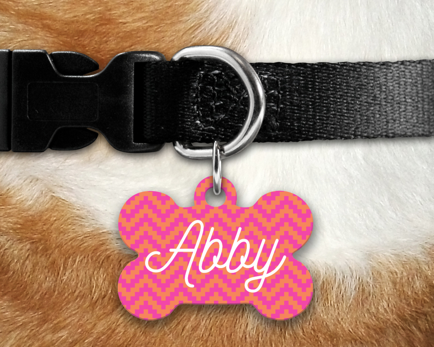 Our default design templates print your dog's personalization on the front and your contact information on the back; however everything is customizable, so you customize the patterns, the colors, the personalization, the contact information etc.