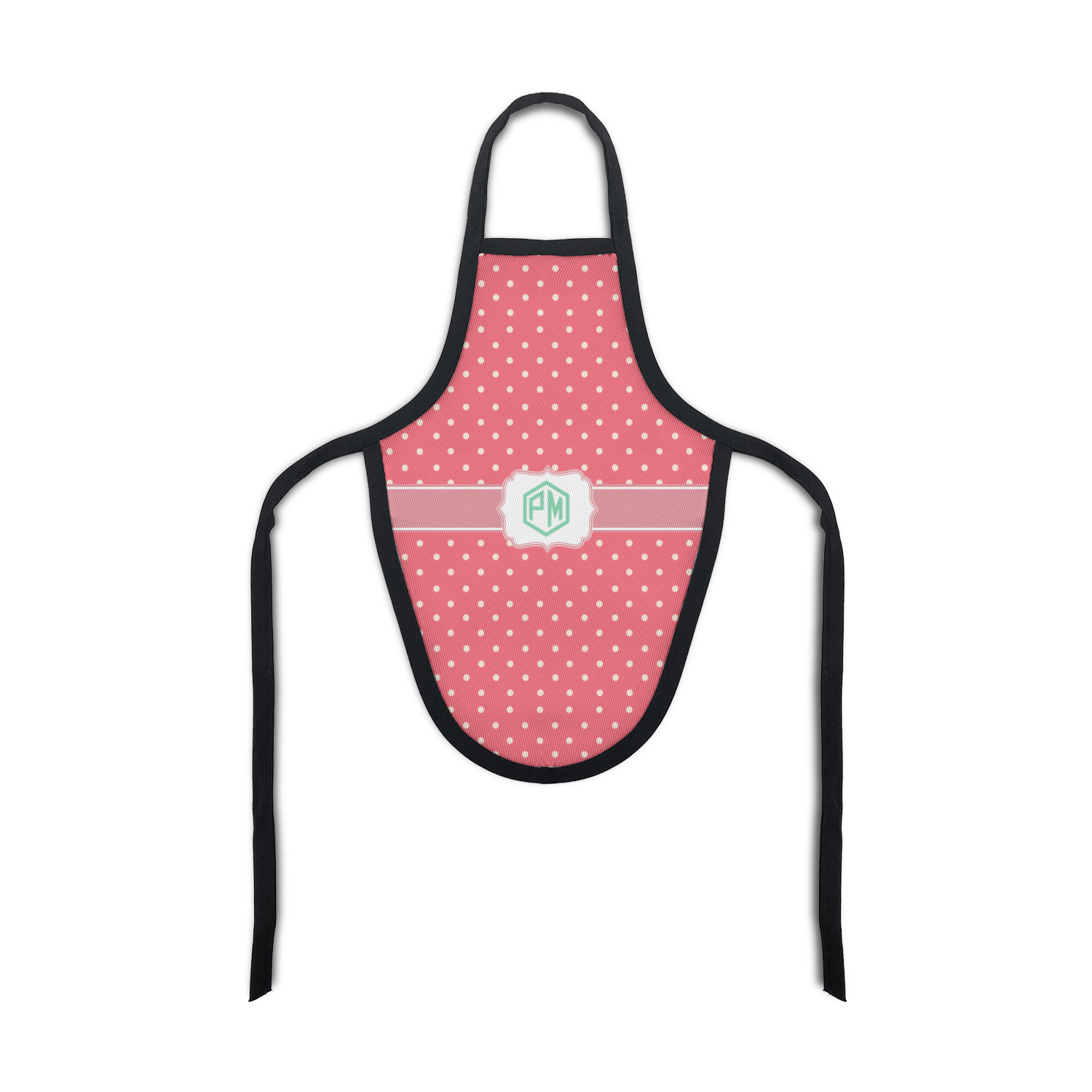Made from a polyester fabric with black trim and tie string, these bottle aprons fit most large sized bottles including wine bottles, liquor bottles and dish soap bottles. With an included sliding cord lock the neck is adjustable to make these be a universal fit for most any sized bottle. The printed space of the apron measures approximately 8.5" tall and at its widest point the printed area is 6" wide.
