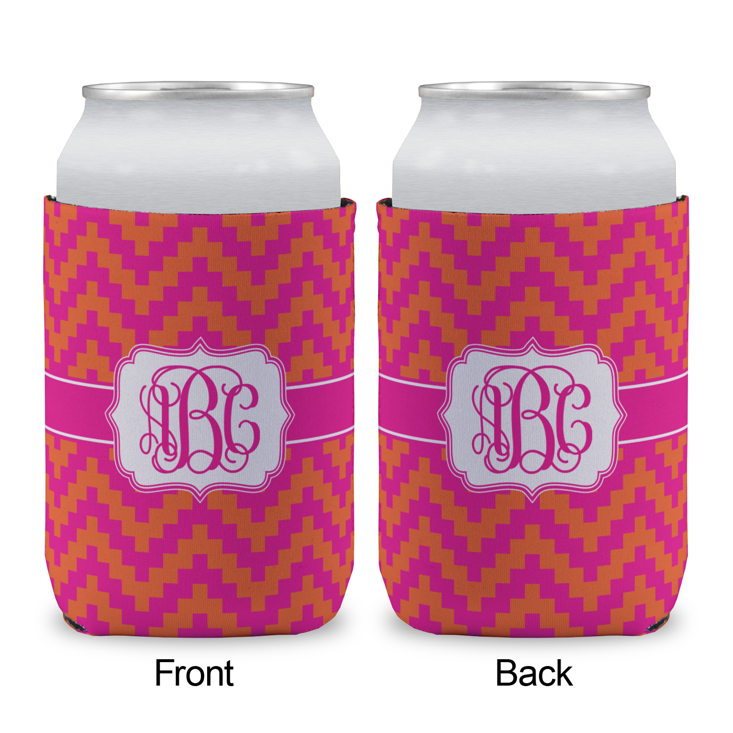 The pixelated chevron stripe pattern alternates between the hot pink and orange. The design has a classic ribbon in hot pink with white stripes. The decorative rectangular label is also in hot pink and white. The personalization is the gorgeous interlocking monogram in hot pink to pull the entire design together.