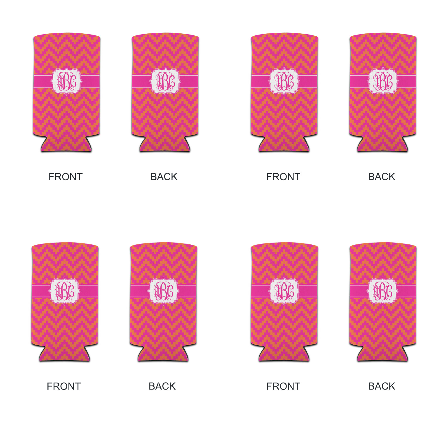 The pixelated chevron stripe pattern alternates between the hot pink and orange. The design has a classic ribbon in hot pink with white stripes. The decorative rectangular label is also in hot pink and white. The personalization is the gorgeous interlocking monogram in hot pink to pull the entire design together.