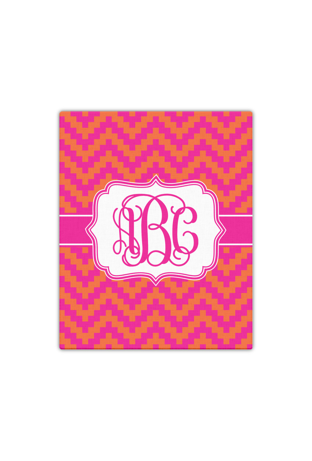 The pixelated chevron stripe pattern alternates between the hot pink and orange. The design has a classic ribbon in hot pink with white stripes. The decorative rectangular label is also in hot pink and white. The personalization is the gorgeous interlocking monogram in hot pink to pull the entire design together.