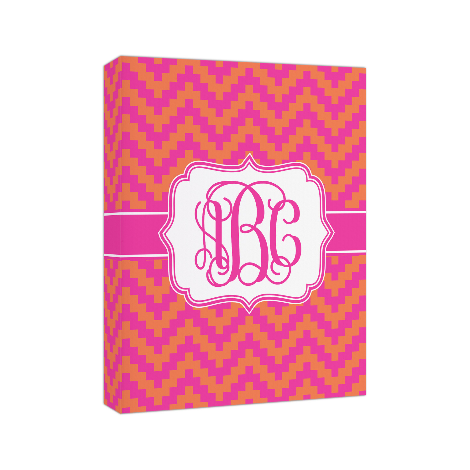 The pixelated chevron stripe pattern alternates between the hot pink and orange. The design has a classic ribbon in hot pink with white stripes. The decorative rectangular label is also in hot pink and white. The personalization is the gorgeous interlocking monogram in hot pink to pull the entire design together.