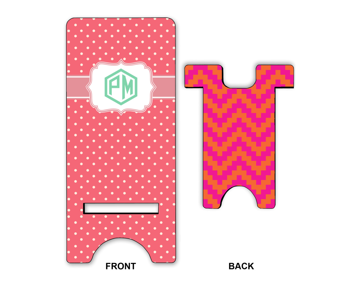 The pixelated chevron stripe pattern alternates between the hot pink and orange. The design has a classic ribbon in hot pink with white stripes. The decorative rectangular label is also in hot pink and white. The personalization is the gorgeous interlocking monogram in hot pink to pull the entire design together.
