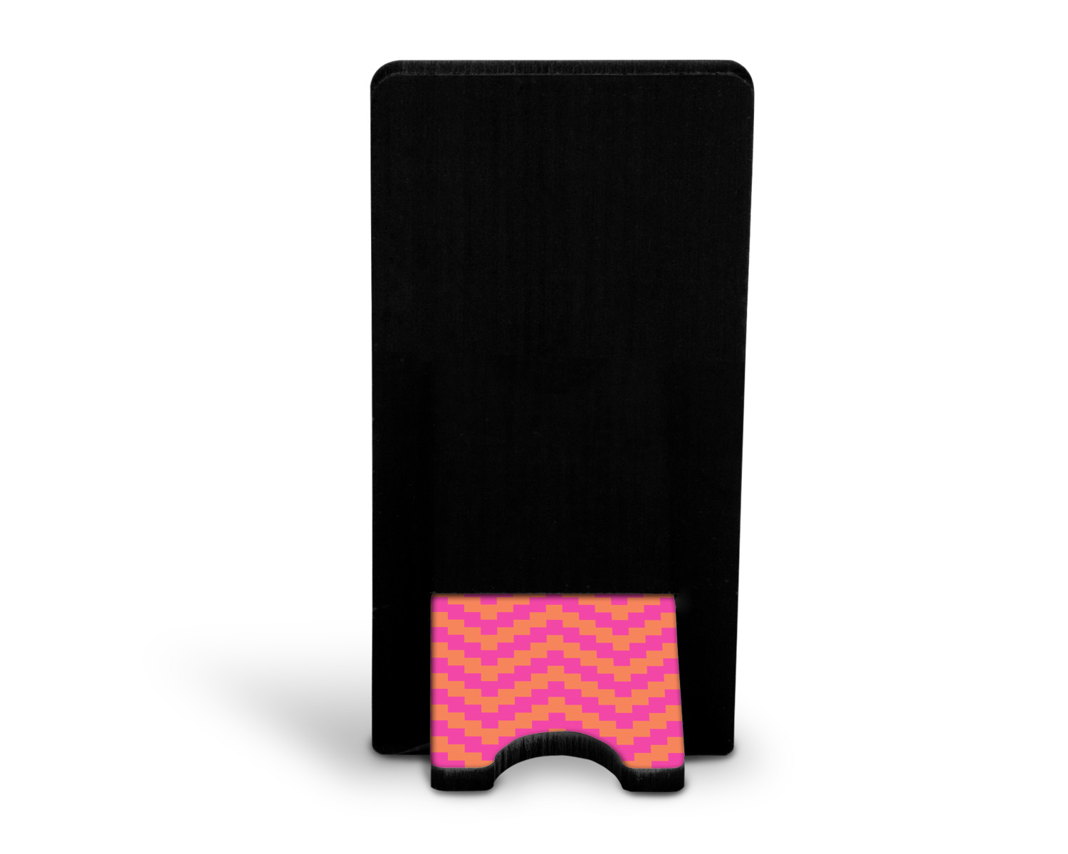 These cell phone holders are comprised of two hardboard pieces, that lock into and steady one another. The bottom part of the mobile phone stand is spacious enough to support both your phone and your charger, while it is not in use. We print your customization atop the face of this stand, while the remaining sides are a sophisticated, black color.