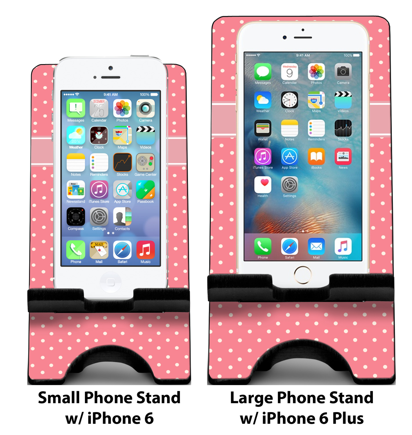 To meet your needs, we offer four variations of this IPhone stand. The backboard of the first version is shaped as a plain, yet sleek rectangle, and is available in two sizes. Our smaller size is approximately 4 by 3.25 by 7 inches, while the larger model is 4 by 3.77 by 8.5 inches. Alongside this model, we also provide you with a more decorative option. The upper part of our second version features a curved edge, for a classy, suave appearance. This phone holder is also sold in two sizes: a smaller version, which is 4 by 3.25 by 7 inches, and our larger model, which is 4 by 3.77 by 8.5 inches. Both models will support large phones, but the larger model is better if you wish to proudly display your personalized design.