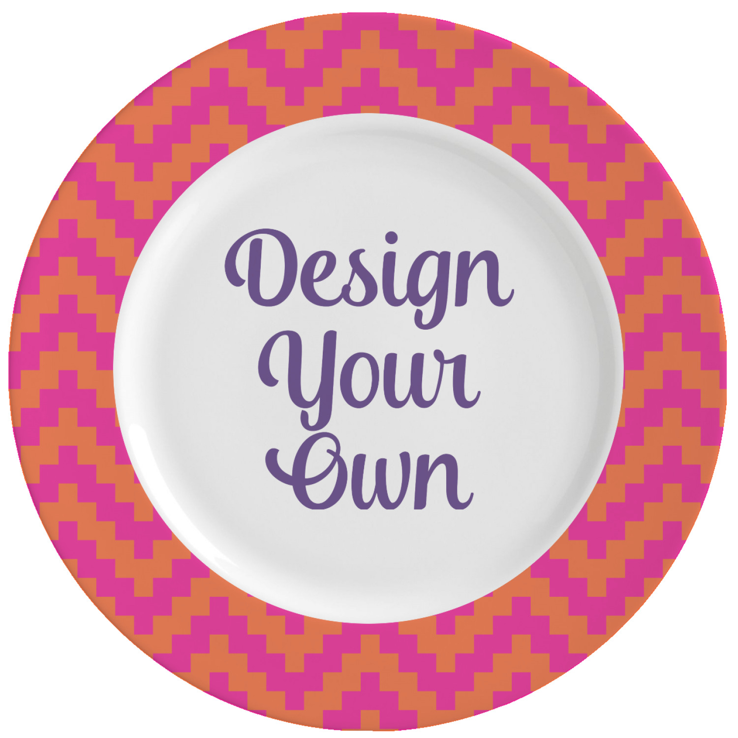With this custom dinner plate, your have the option of personalizing the rim with an attractive pattern, and then displaying a name, graphic, or text in the center of the plate, against a white background. The exterior of this plate is also the same classic, white color. A glaze coats your plate, making your vividly colored design seem even more vibrant.