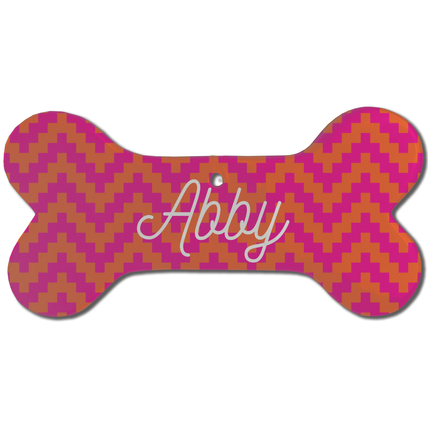 The pixelated chevron stripe pattern alternates between the hot pink and orange. The design has a classic ribbon in hot pink with white stripes. The decorative rectangular label is also in hot pink and white. The personalization is the gorgeous interlocking monogram in hot pink to pull the entire design together.