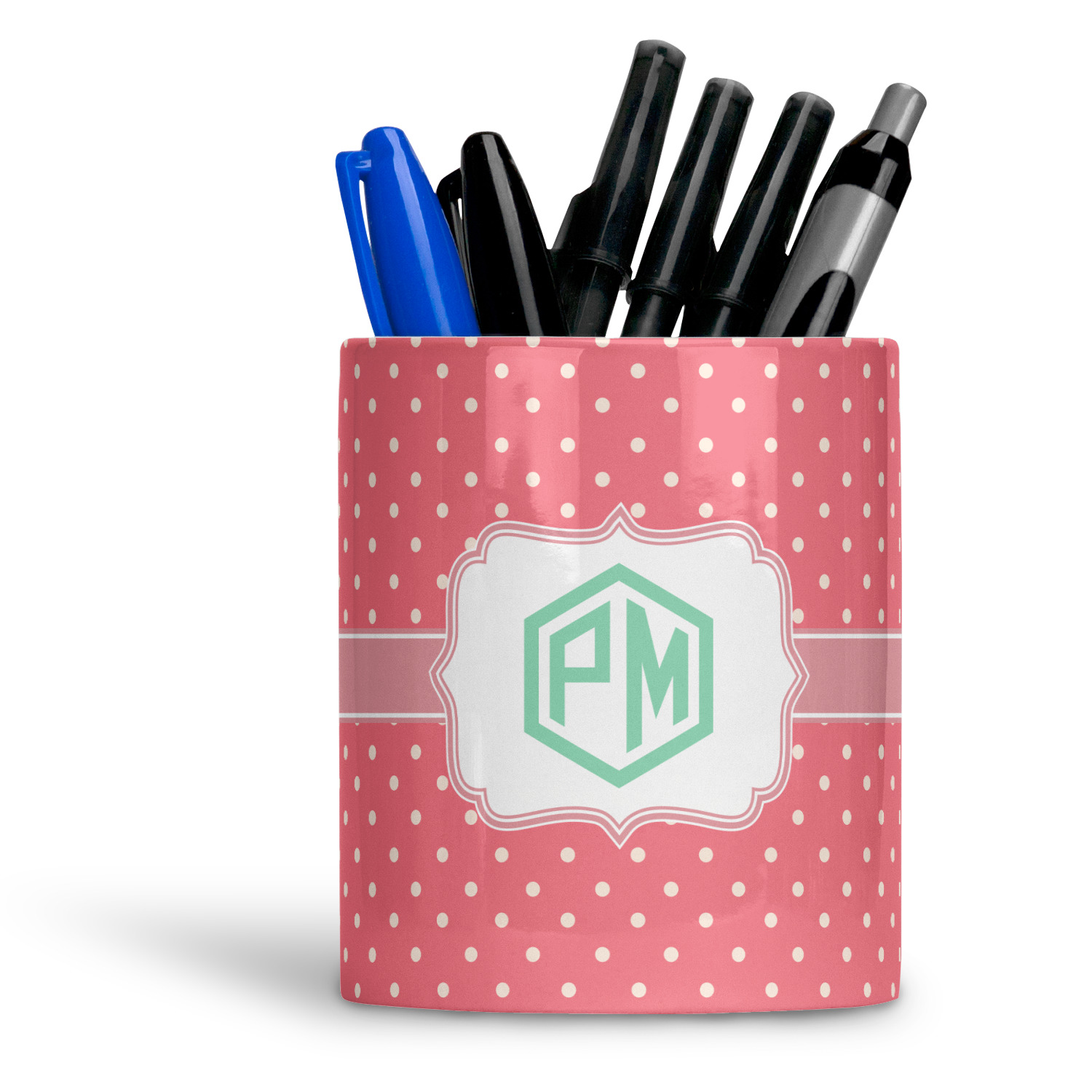 Made from white ceramic, this pen holder displays your personalized design across its surface. This pen organizer measures at 3.75" high by 3.25 inches diameter and has ample space for several pens, pencils, scissors, markers, and more! This is also a multipurpose accessory; you can use it to store makeup brushes, other utensils, and more!