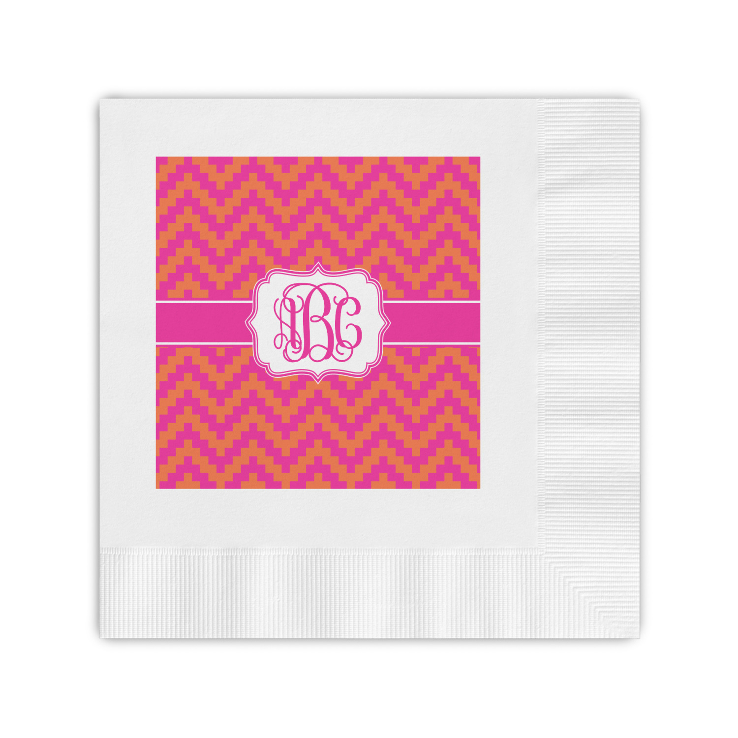 The pixelated chevron stripe pattern alternates between the hot pink and orange. The design has a classic ribbon in hot pink with white stripes. The decorative rectangular label is also in hot pink and white. The personalization is the gorgeous interlocking monogram in hot pink to pull the entire design together.