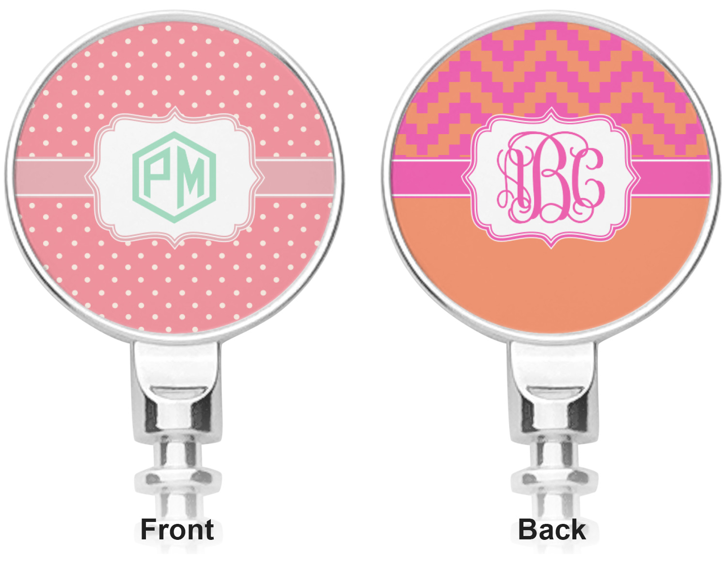 The pixelated chevron stripe pattern alternates between the hot pink and orange. The design has a classic ribbon in hot pink with white stripes. The decorative rectangular label is also in hot pink and white. The personalization is the gorgeous interlocking monogram in hot pink to pull the entire design together.