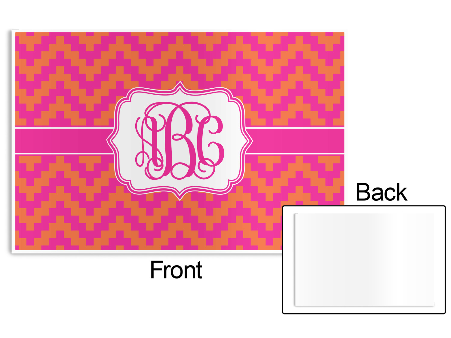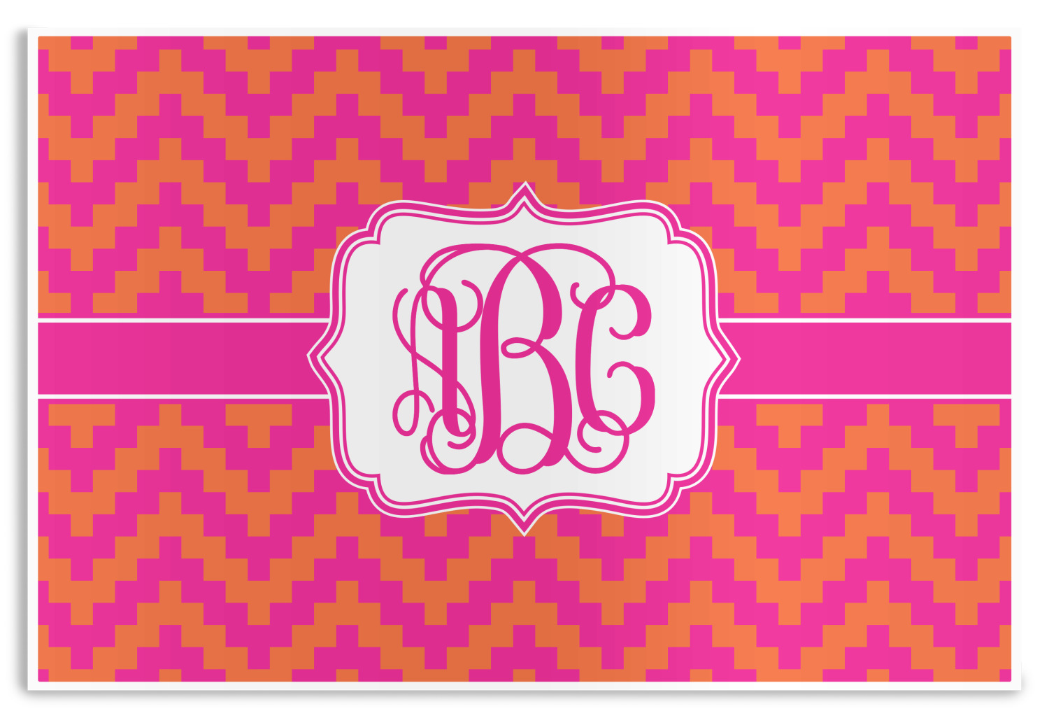 The pixelated chevron stripe pattern alternates between the hot pink and orange. The design has a classic ribbon in hot pink with white stripes. The decorative rectangular label is also in hot pink and white. The personalization is the gorgeous interlocking monogram in hot pink to pull the entire design together.