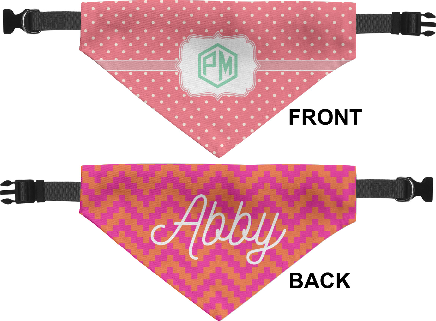 We print the front and back of these dog bandanas with your customized design. The bandana itself is made from a durable polyester, sewn together with a gap large enough to accommodate any collar. Regardless, the bandana includes a plain black, canvas collar with plastic snaps, that can easily be removed if desired. These dog bandana collars are available in four sizes: small, medium, large, and extra large. Please see our sizing chart for more information regarding the dimensions of each size.