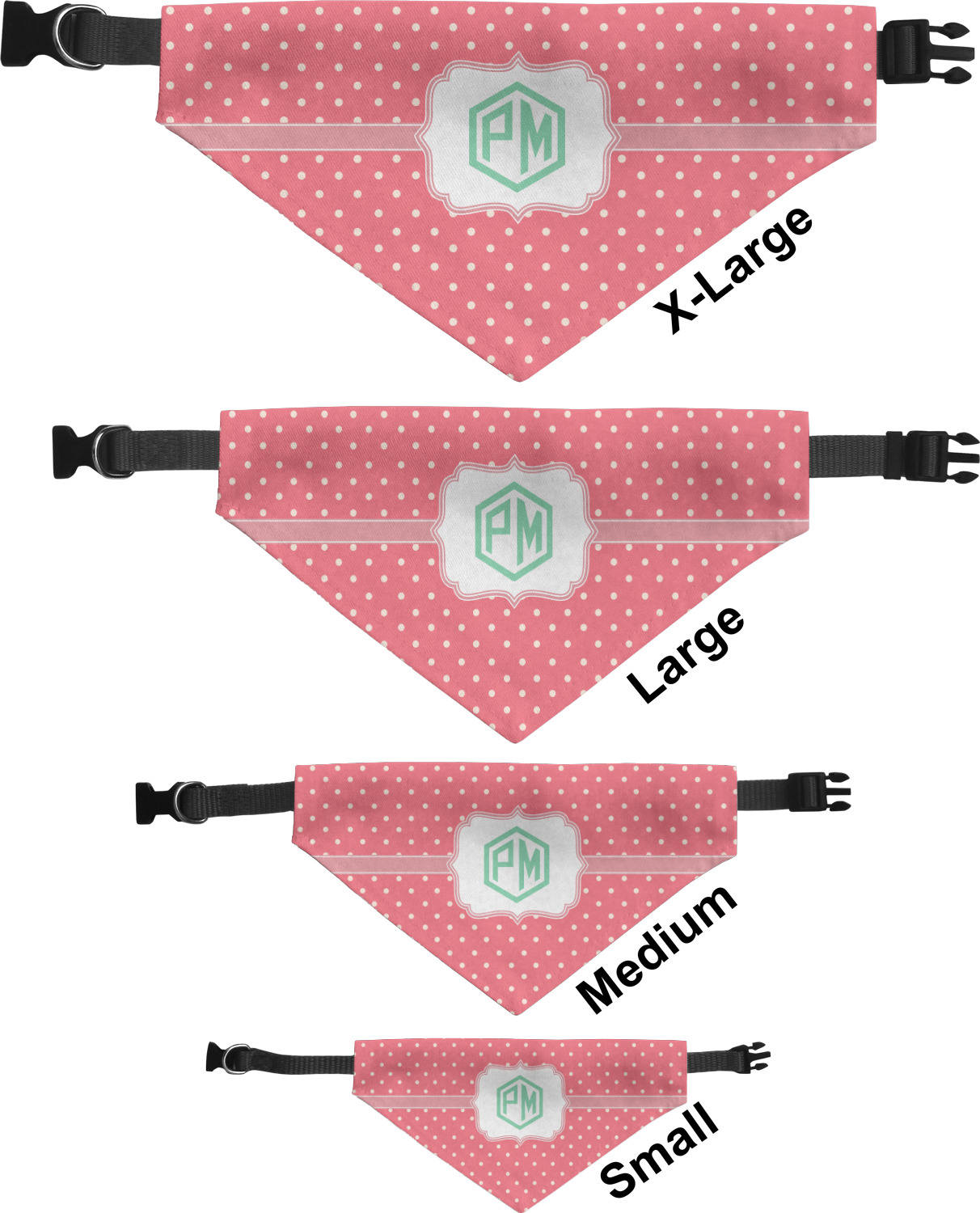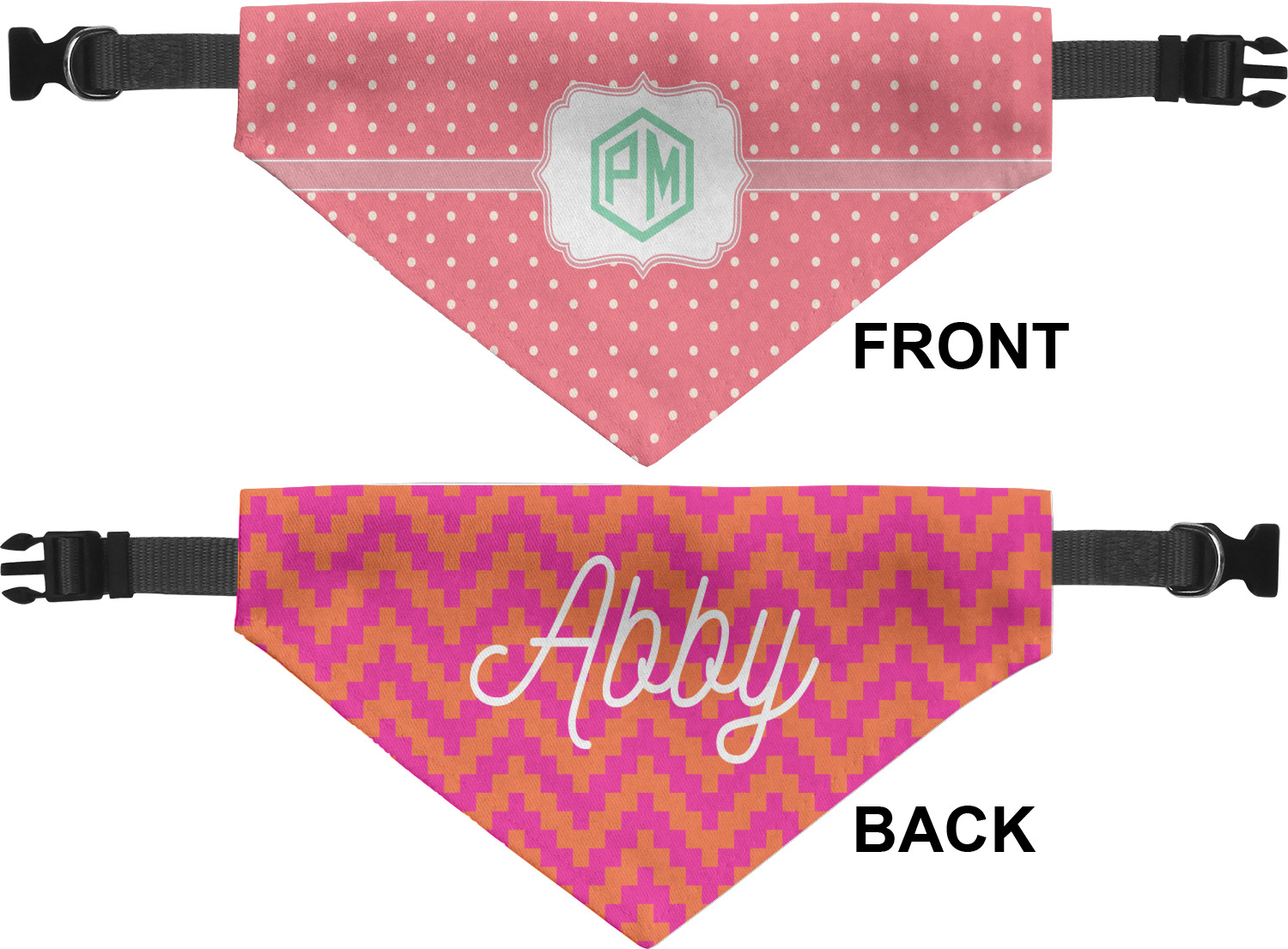 We print the front and back of these dog bandanas with your customized design. The bandana itself is made from a durable polyester, sewn together with a gap large enough to accommodate any collar. Regardless, the bandana includes a plain black, canvas collar with plastic snaps, that can easily be removed if desired. These dog bandana collars are available in four sizes: small, medium, large, and extra large. Please see our sizing chart for more information regarding the dimensions of each size.