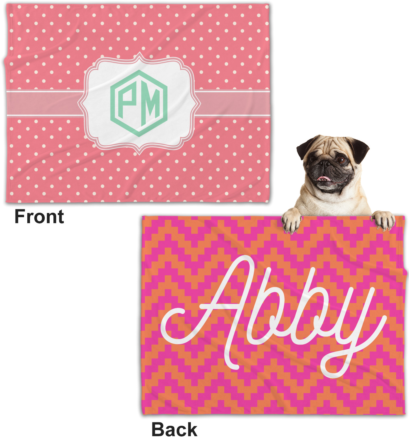 These dog blankets are crafted from a gentle, soft-to-the-touch, minky material. We print your customizations, either matching or differing, on both the top and underside of the blanket. These personalized dog blankets are available in two sizes: regular and large. Our regular size, at 40" x 30", accommodates small and some medium size dogs. At 60" x 50", our large dog blanket is a better fit for bigger breeds. Though specialized for dogs, these blankets still make a thoughtful gift for your favorite feline, or any other pet in mind!