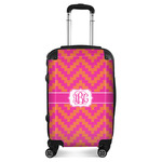 The pixelated chevron stripe pattern alternates between the hot pink and orange. The design has a classic ribbon in hot pink with white stripes. The decorative rectangular label is also in hot pink and white. The personalization is the gorgeous interlocking monogram in hot pink to pull the entire design together.
