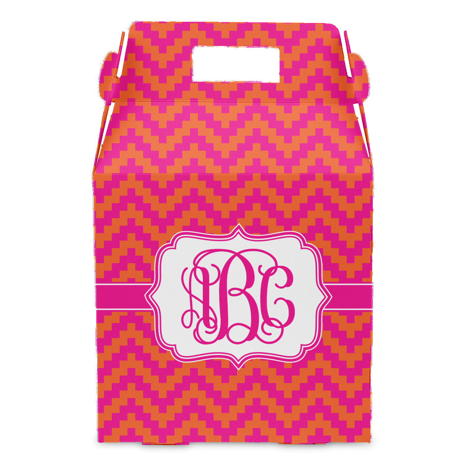 The pixelated chevron stripe pattern alternates between the hot pink and orange. The design has a classic ribbon in hot pink with white stripes. The decorative rectangular label is also in hot pink and white. The personalization is the gorgeous interlocking monogram in hot pink to pull the entire design together.
