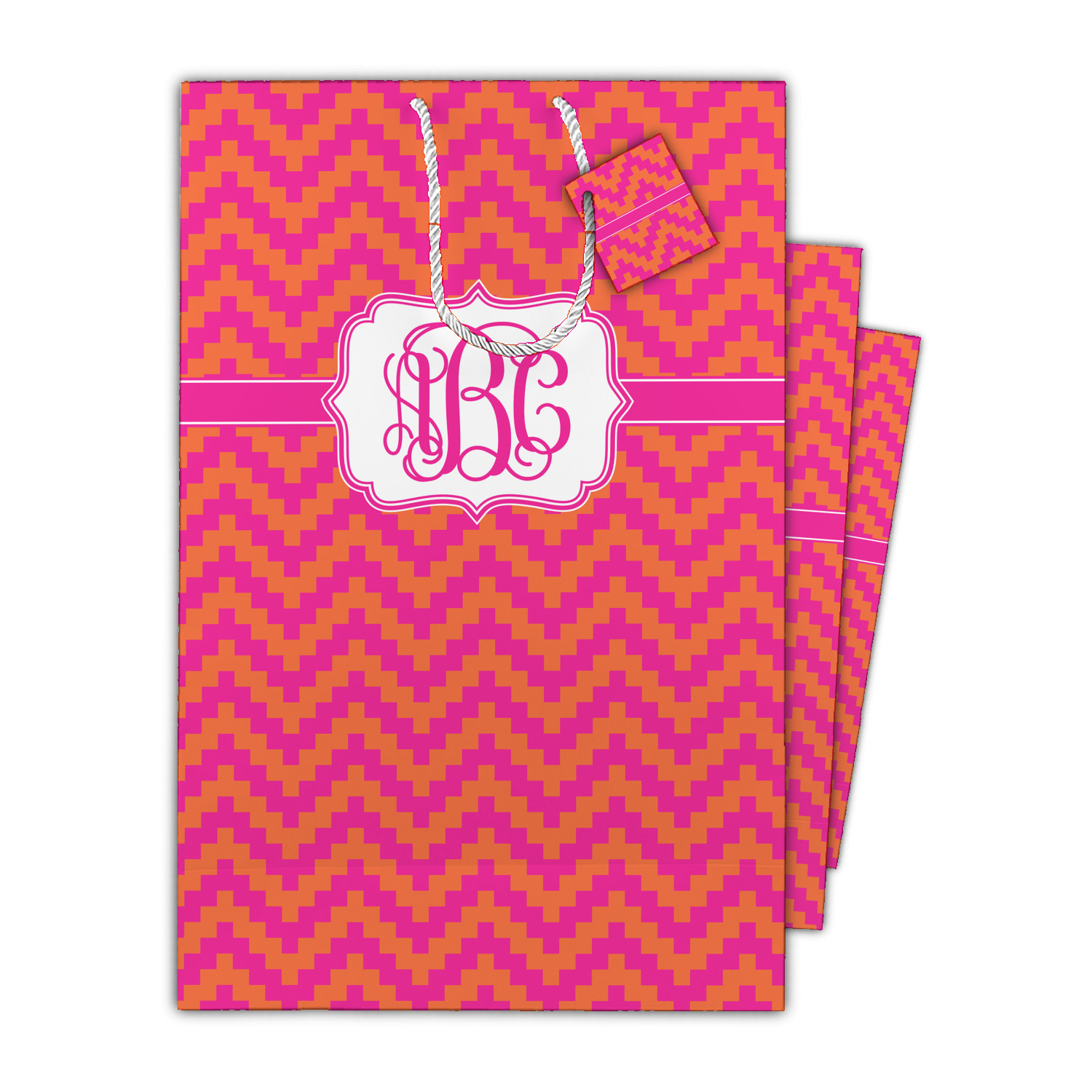 The pixelated chevron stripe pattern alternates between the hot pink and orange. The design has a classic ribbon in hot pink with white stripes. The decorative rectangular label is also in hot pink and white. The personalization is the gorgeous interlocking monogram in hot pink to pull the entire design together.