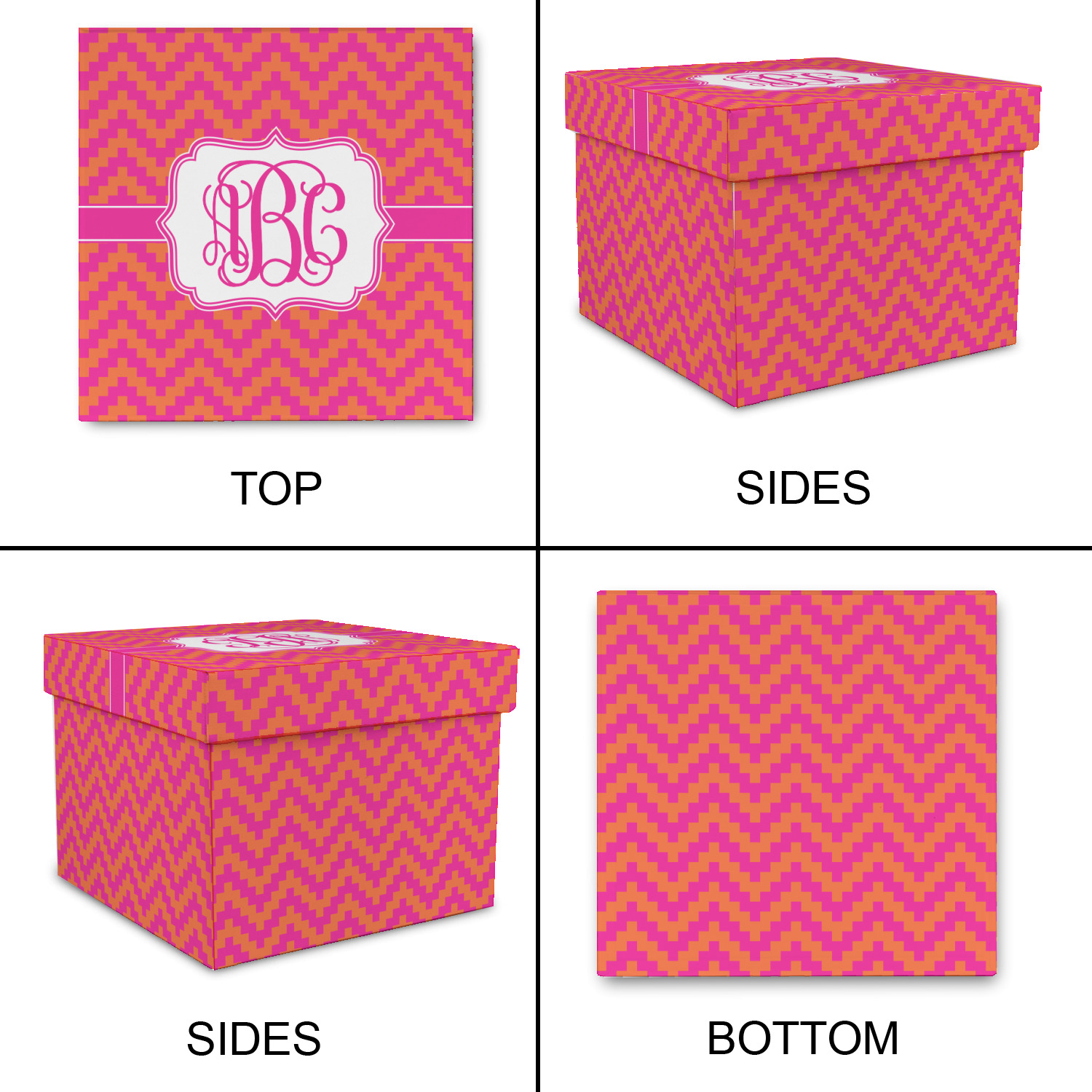 The pixelated chevron stripe pattern alternates between the hot pink and orange. The design has a classic ribbon in hot pink with white stripes. The decorative rectangular label is also in hot pink and white. The personalization is the gorgeous interlocking monogram in hot pink to pull the entire design together.