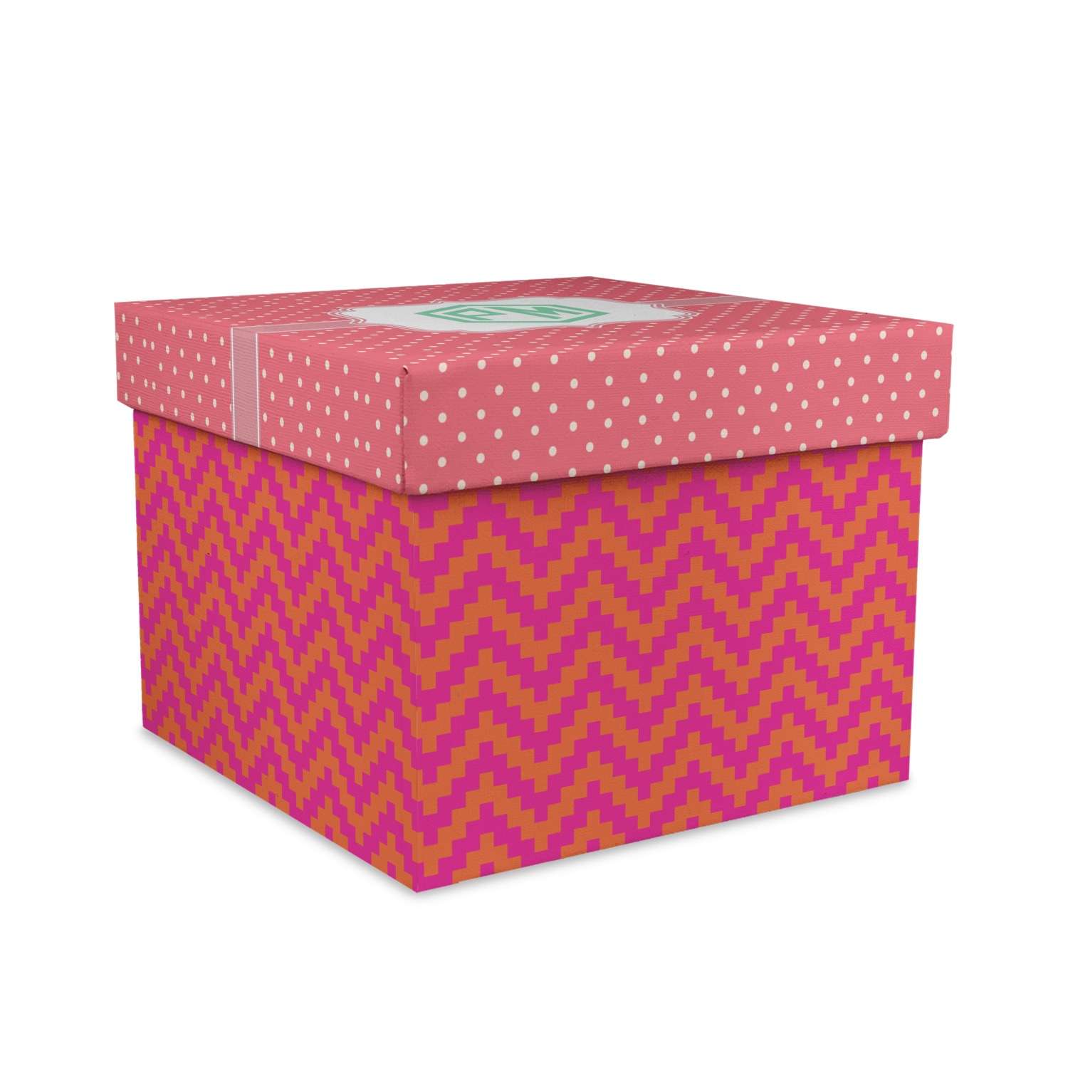 The pixelated chevron stripe pattern alternates between the hot pink and orange. The design has a classic ribbon in hot pink with white stripes. The decorative rectangular label is also in hot pink and white. The personalization is the gorgeous interlocking monogram in hot pink to pull the entire design together.
