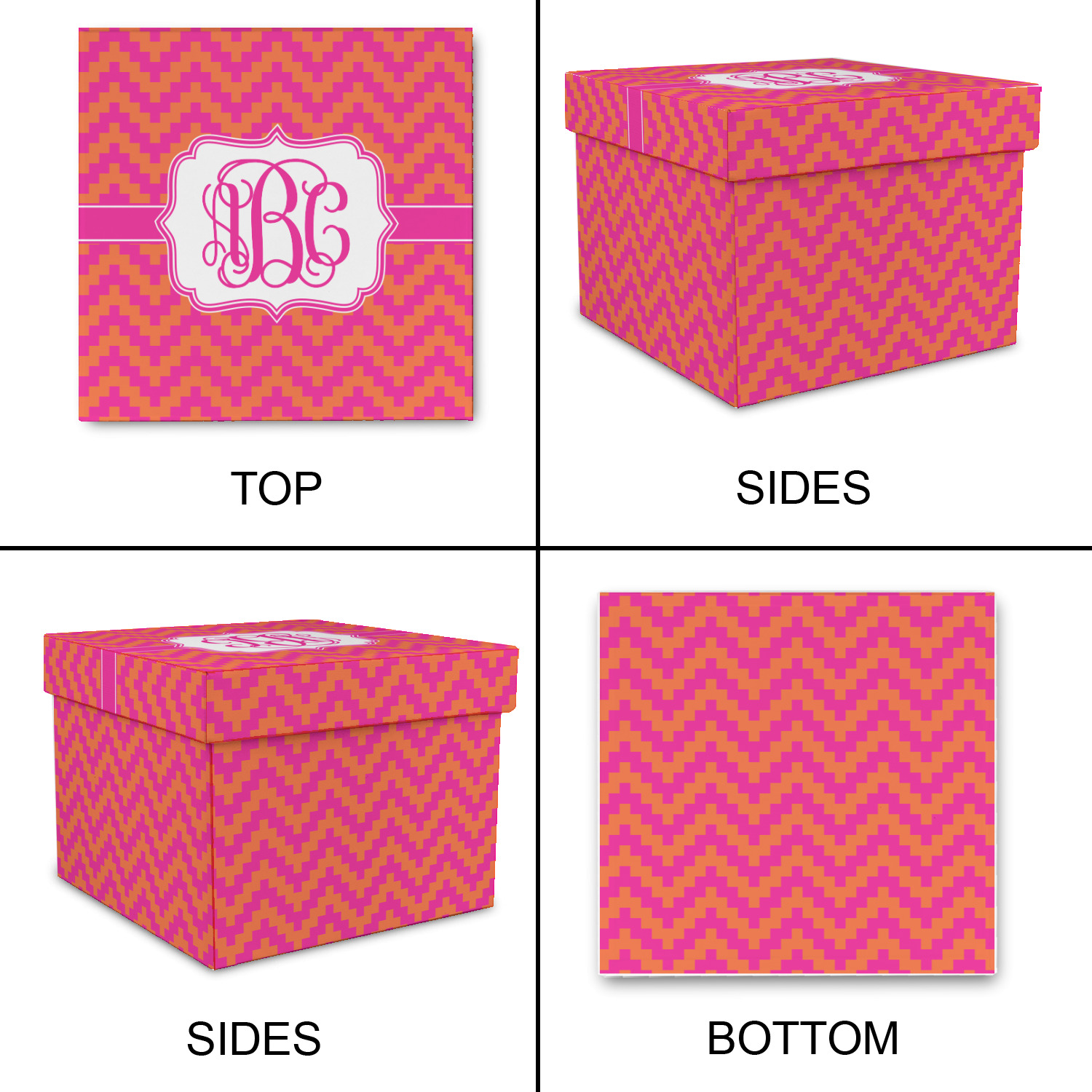 The pixelated chevron stripe pattern alternates between the hot pink and orange. The design has a classic ribbon in hot pink with white stripes. The decorative rectangular label is also in hot pink and white. The personalization is the gorgeous interlocking monogram in hot pink to pull the entire design together.