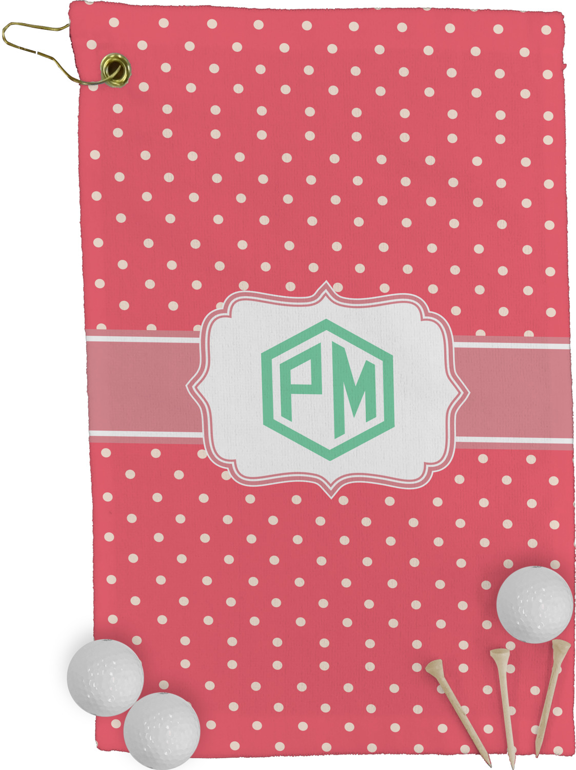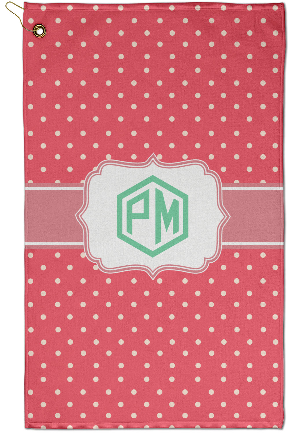 The towel is fully printed / patterned on the front polyester side; and is white on terrycloth cotton backside. The towel has grommet and a pear spring clip in the top left corner. Our golf towels are available in 100s of different prints and patterns.