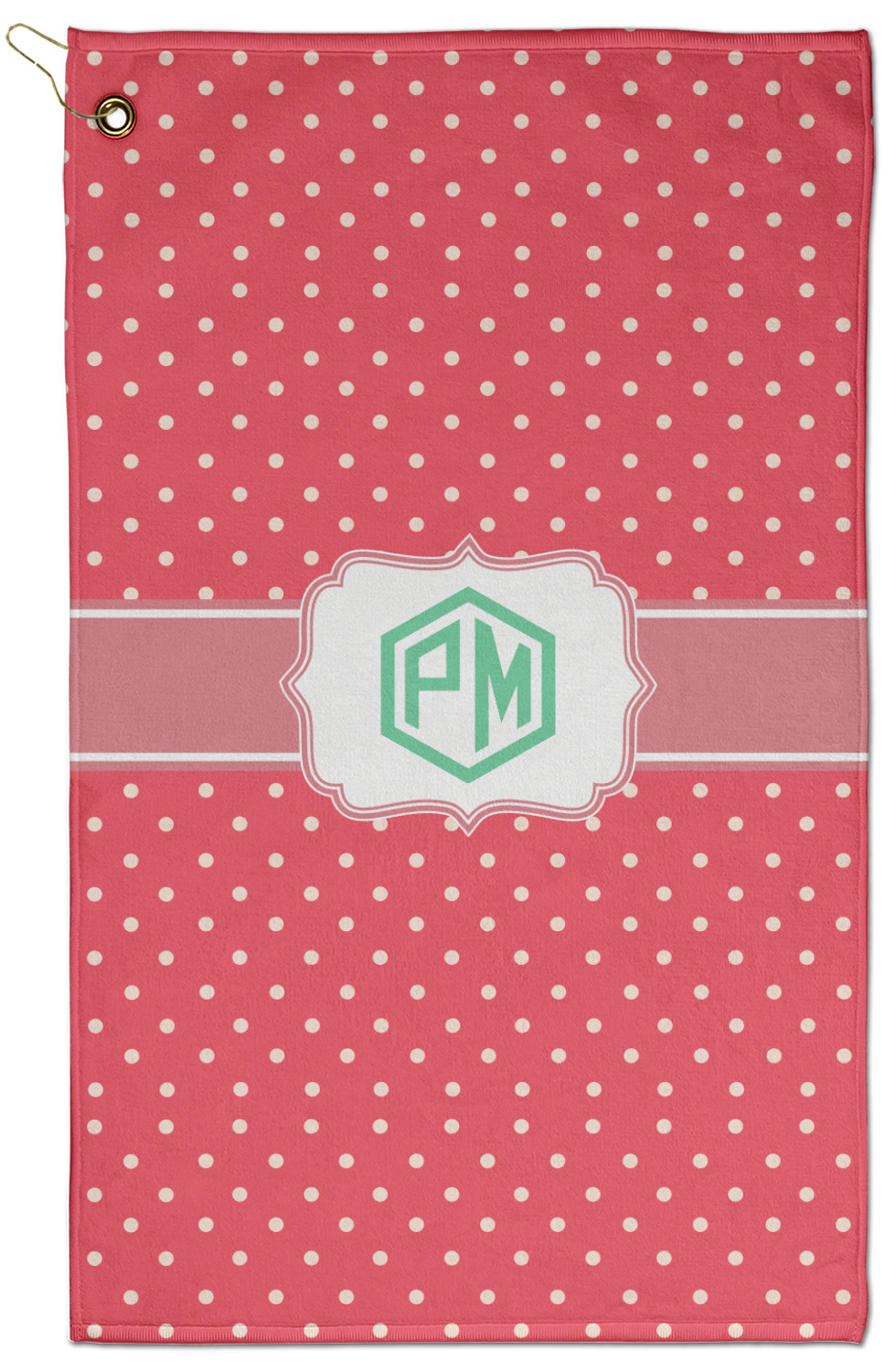 The towel is fully printed / patterned on the front polyester side; and is white on terrycloth cotton backside. The towel has grommet and a pear spring clip in the top left corner. Our golf towels are available in 100s of different prints and patterns.