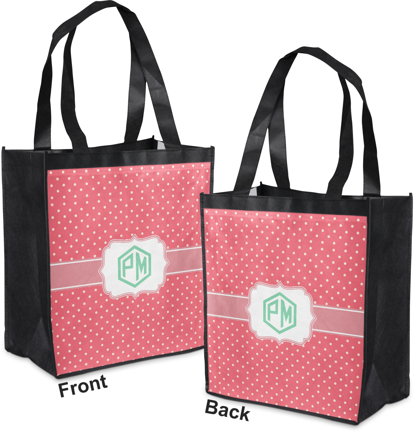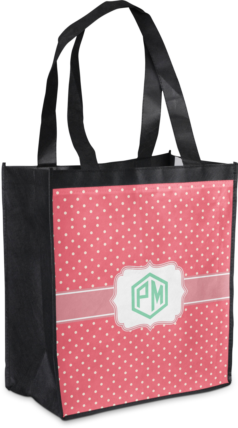 Made from a durable, biodegradable material, these reusable shopping bags can support up to 30 pounds of weight. With two large handles, measuring at 8.5 inches each, these personalized tote bags are easy to carry to your vehicle or home. The bag itself is 12 by 13.5 inches, and can expand to a depth of 7 inches. Your customization is printed on both the front and back, while the remaining sides, trim, and handle are a sleek, charcoal black.