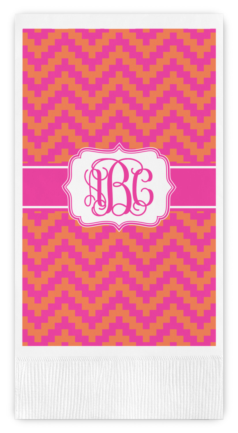 The pixelated chevron stripe pattern alternates between the hot pink and orange. The design has a classic ribbon in hot pink with white stripes. The decorative rectangular label is also in hot pink and white. The personalization is the gorgeous interlocking monogram in hot pink to pull the entire design together.