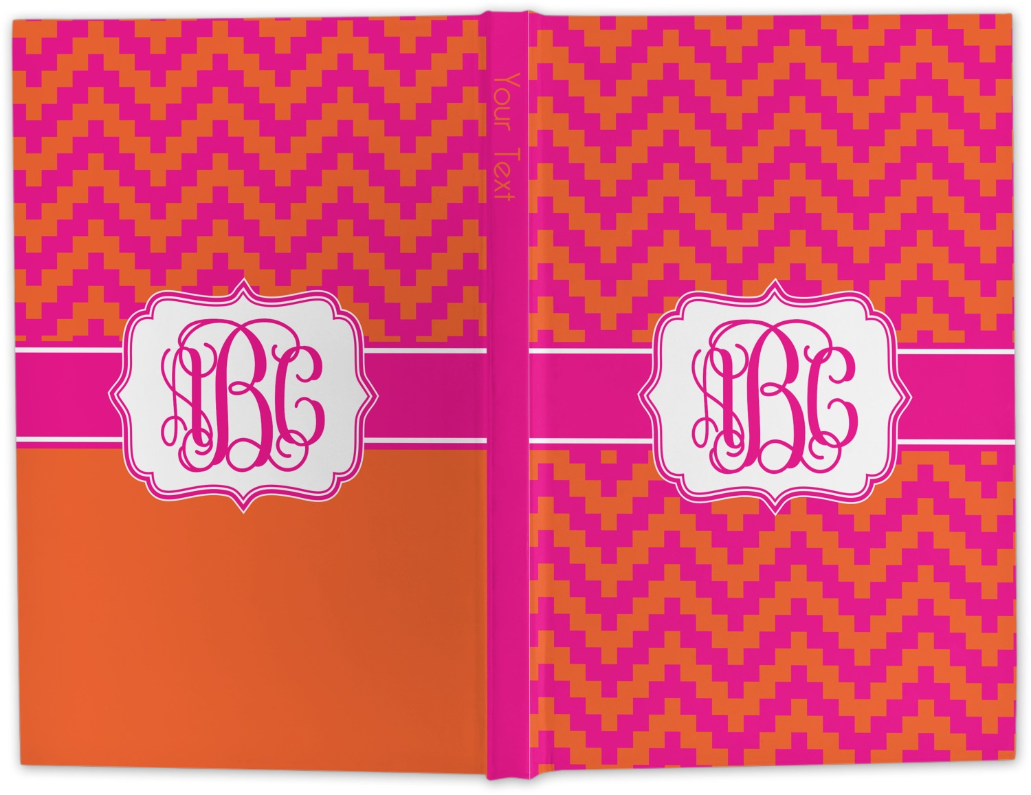 The pixelated chevron stripe pattern alternates between the hot pink and orange. The design has a classic ribbon in hot pink with white stripes. The decorative rectangular label is also in hot pink and white. The personalization is the gorgeous interlocking monogram in hot pink to pull the entire design together.