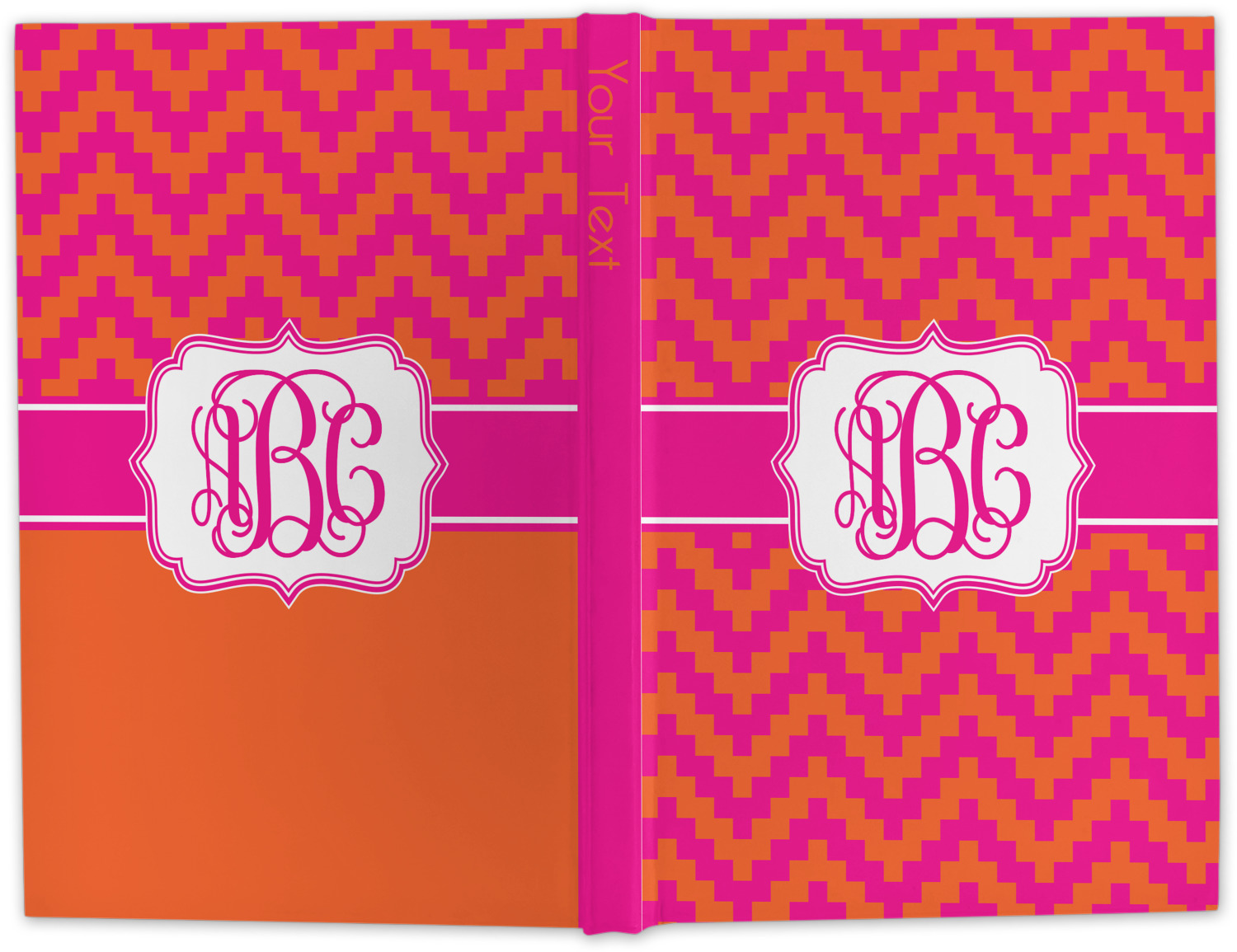 The pixelated chevron stripe pattern alternates between the hot pink and orange. The design has a classic ribbon in hot pink with white stripes. The decorative rectangular label is also in hot pink and white. The personalization is the gorgeous interlocking monogram in hot pink to pull the entire design together.