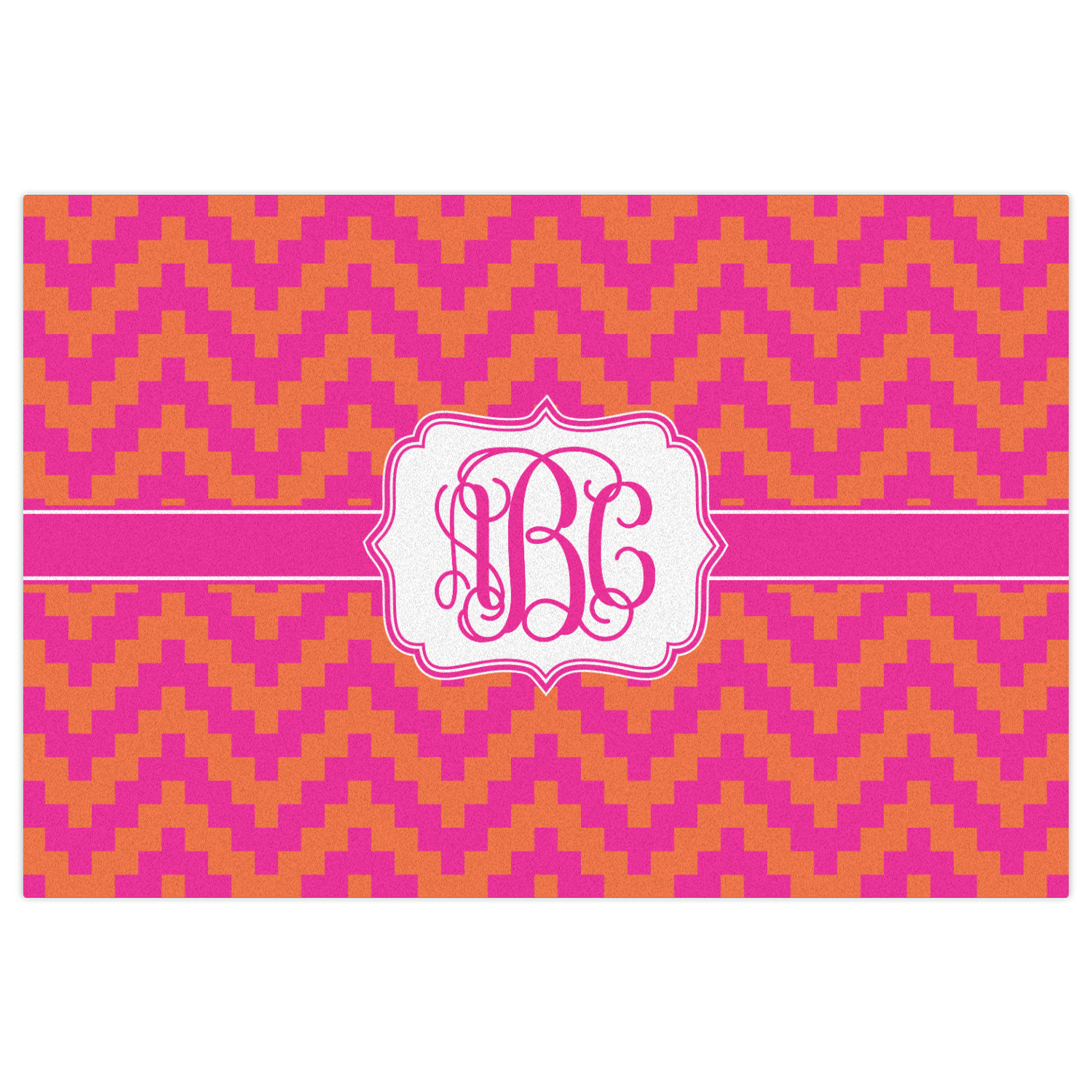 The pixelated chevron stripe pattern alternates between the hot pink and orange. The design has a classic ribbon in hot pink with white stripes. The decorative rectangular label is also in hot pink and white. The personalization is the gorgeous interlocking monogram in hot pink to pull the entire design together.