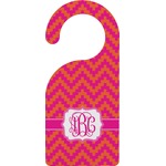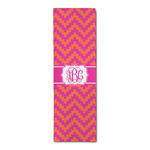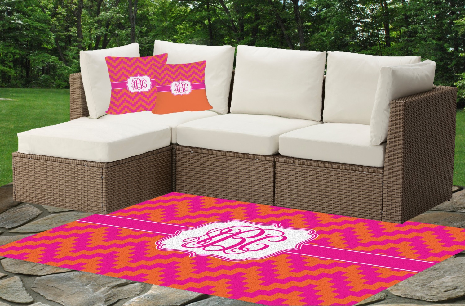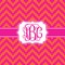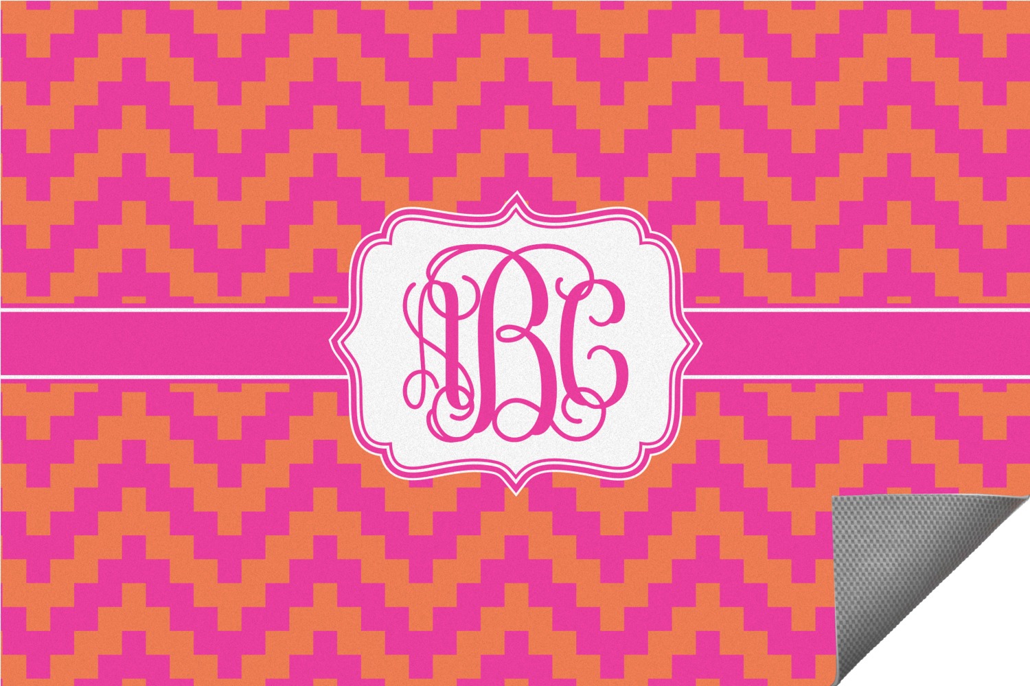 The pixelated chevron stripe pattern alternates between the hot pink and orange. The design has a classic ribbon in hot pink with white stripes. The decorative rectangular label is also in hot pink and white. The personalization is the gorgeous interlocking monogram in hot pink to pull the entire design together.