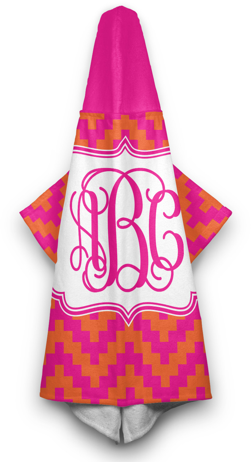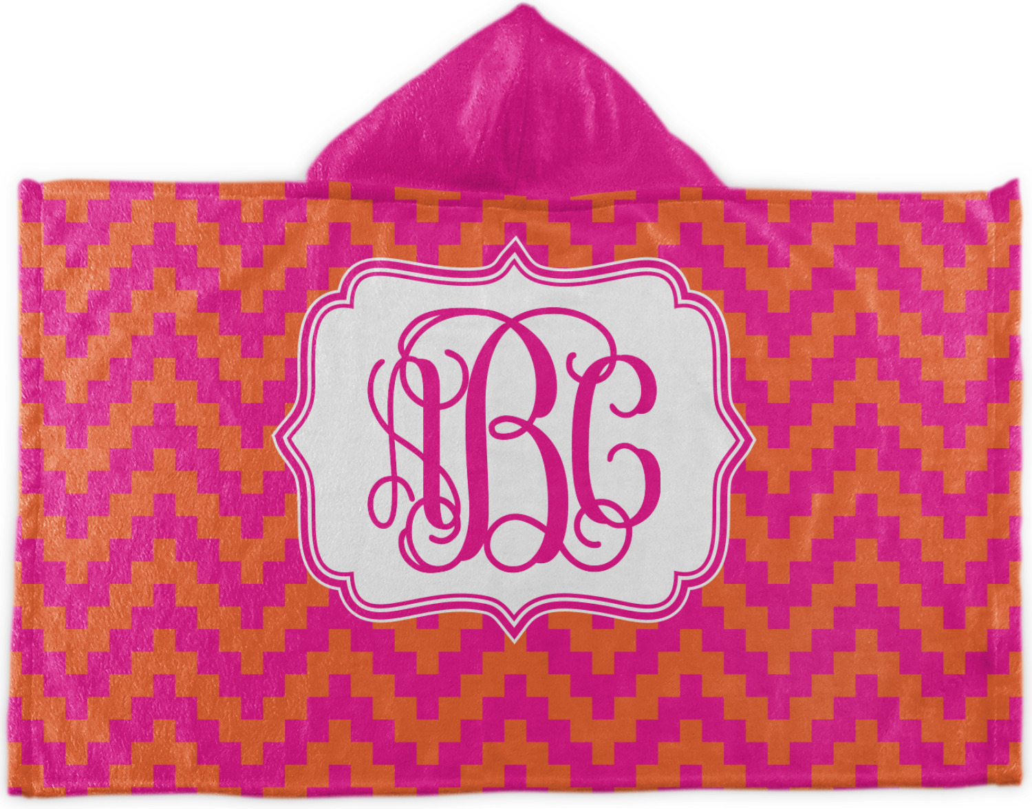 The pixelated chevron stripe pattern alternates between the hot pink and orange. The design has a classic ribbon in hot pink with white stripes. The decorative rectangular label is also in hot pink and white. The personalization is the gorgeous interlocking monogram in hot pink to pull the entire design together.