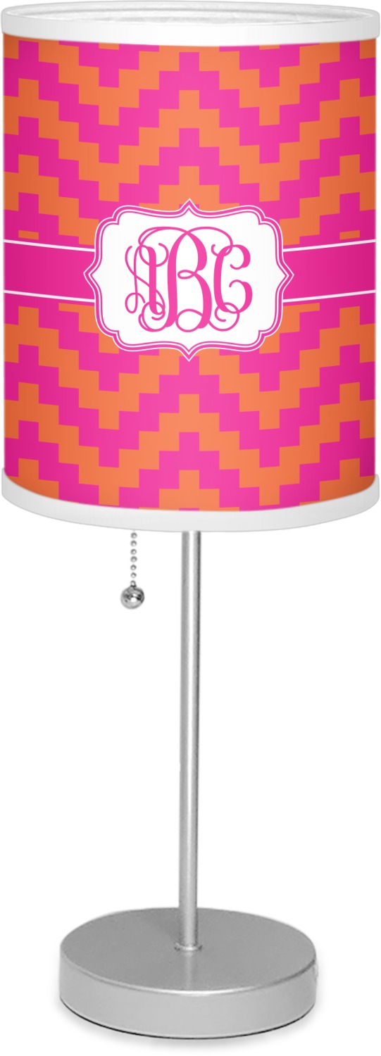 The pixelated chevron stripe pattern alternates between the hot pink and orange. The design has a classic ribbon in hot pink with white stripes. The decorative rectangular label is also in hot pink and white. The personalization is the gorgeous interlocking monogram in hot pink to pull the entire design together.