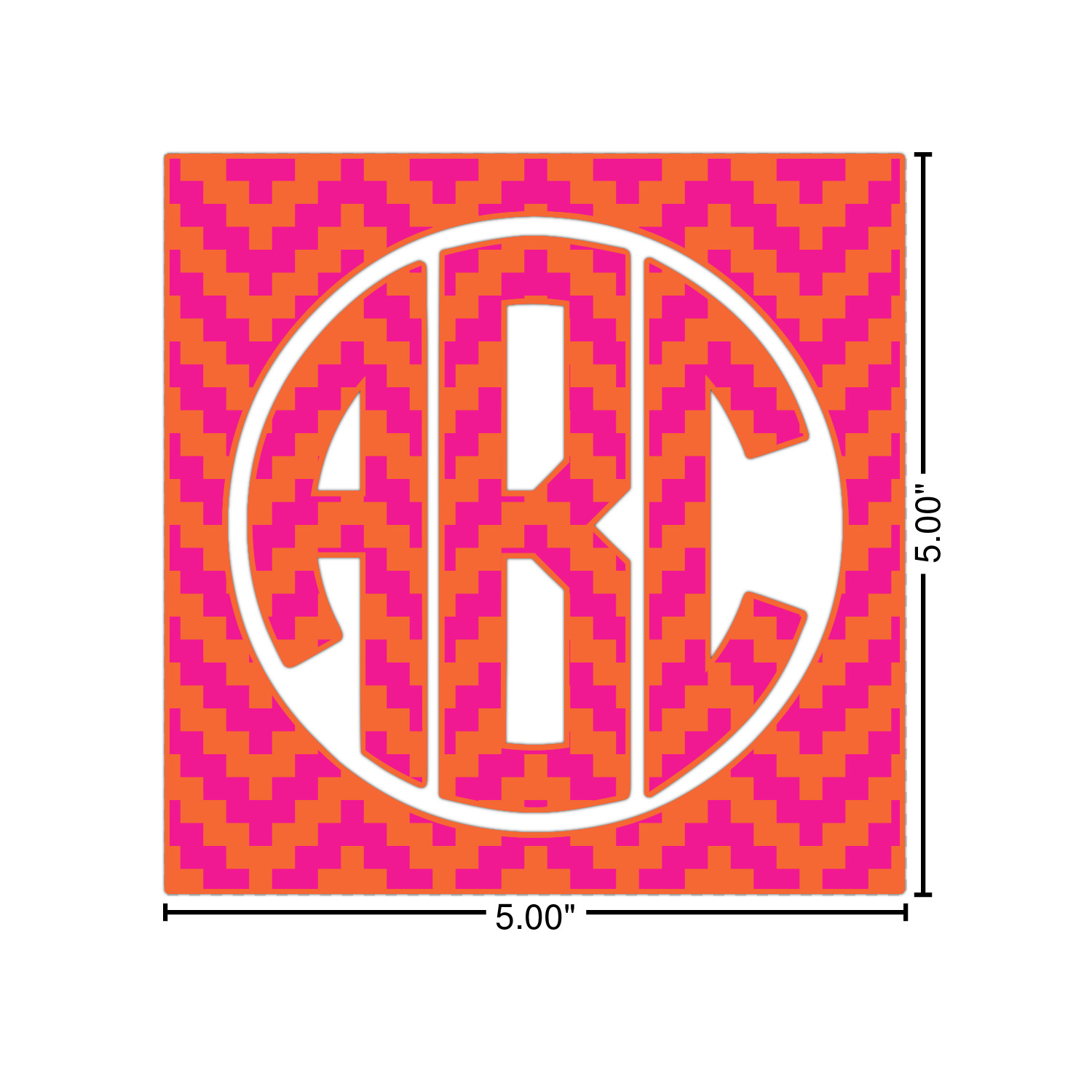 The pixelated chevron stripe pattern alternates between the hot pink and orange. The design has a classic ribbon in hot pink with white stripes. The decorative rectangular label is also in hot pink and white. The personalization is the gorgeous interlocking monogram in hot pink to pull the entire design together.