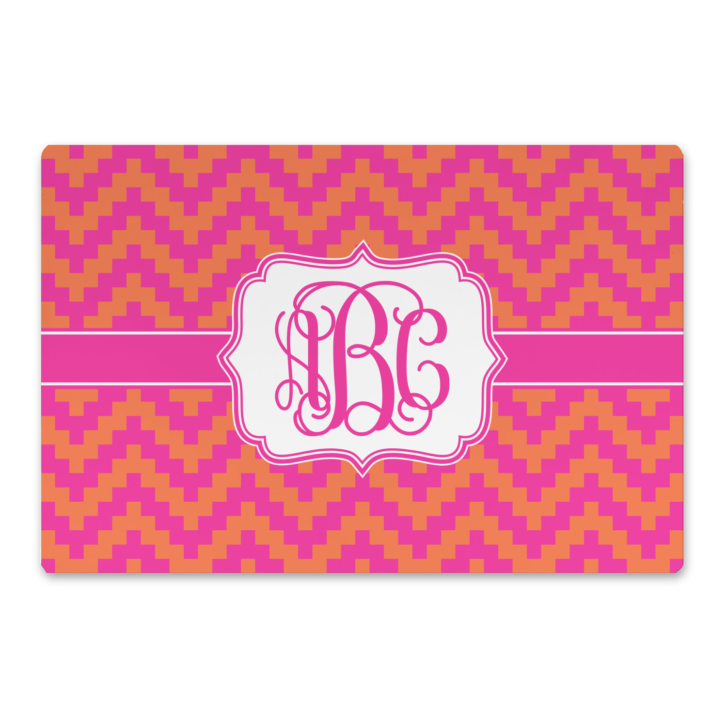 The pixelated chevron stripe pattern alternates between the hot pink and orange. The design has a classic ribbon in hot pink with white stripes. The decorative rectangular label is also in hot pink and white. The personalization is the gorgeous interlocking monogram in hot pink to pull the entire design together.