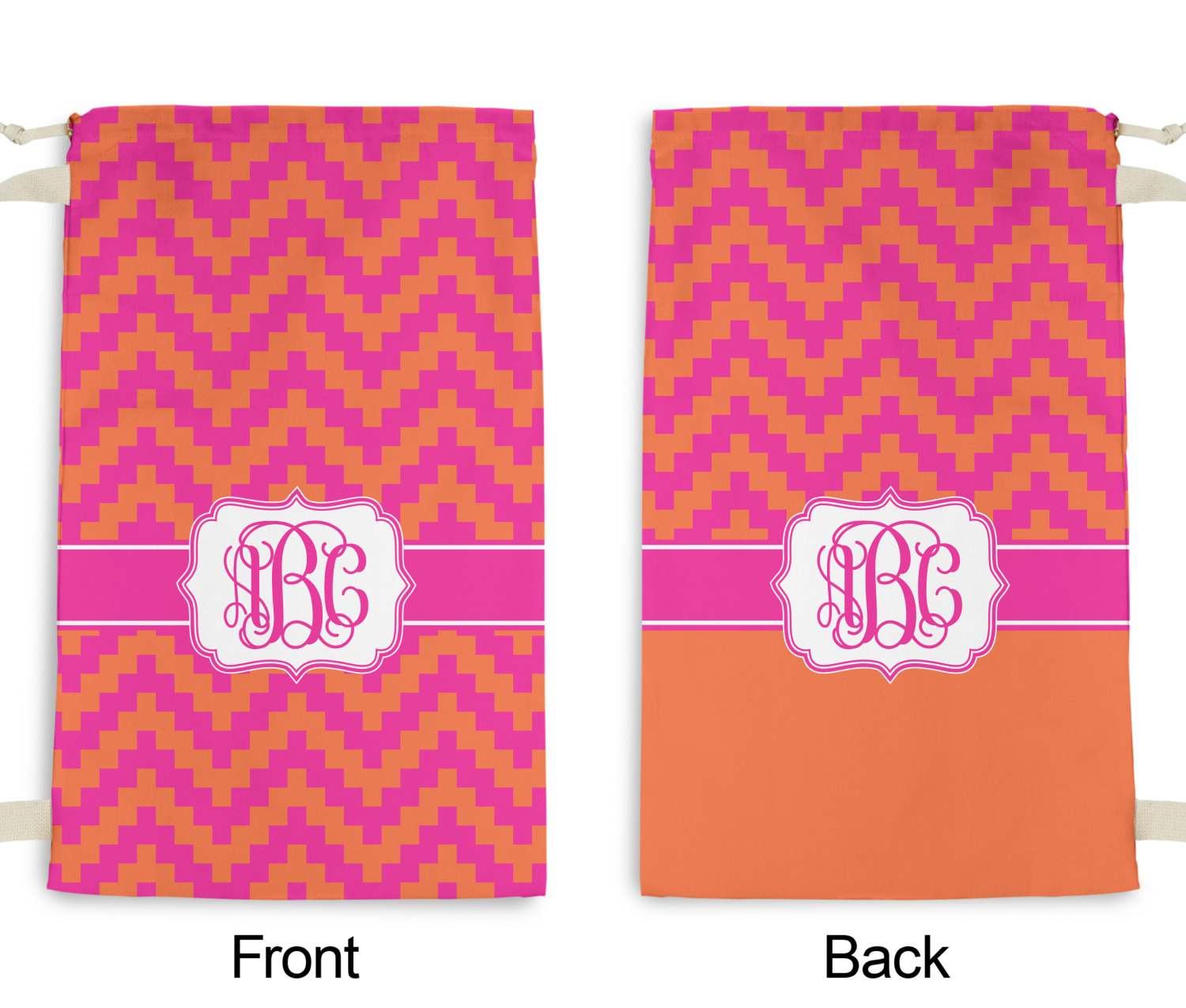 The pixelated chevron stripe pattern alternates between the hot pink and orange. The design has a classic ribbon in hot pink with white stripes. The decorative rectangular label is also in hot pink and white. The personalization is the gorgeous interlocking monogram in hot pink to pull the entire design together.