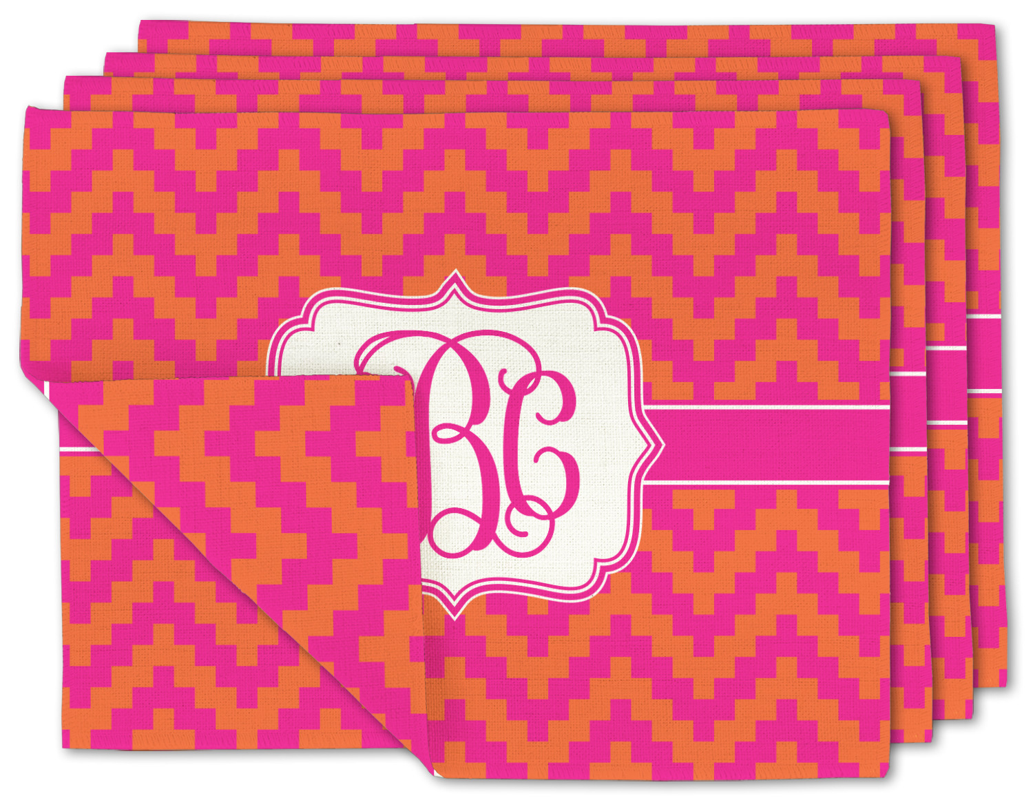 The pixelated chevron stripe pattern alternates between the hot pink and orange. The design has a classic ribbon in hot pink with white stripes. The decorative rectangular label is also in hot pink and white. The personalization is the gorgeous interlocking monogram in hot pink to pull the entire design together.